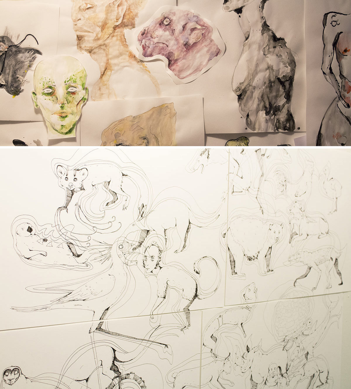 L’intérêt pour la figure de l’animal occupe une place importante dans ma pratique artistique, mais plus généralement, je m’intéresse aux tensions et ressemblances entre animal et humain. Dans mes œuvres, je brouille la frontière qui sépare leurs mondes respectifs tant visuellement que d’un point de vue comportemental. La plasticité du dessin me permet d’étudier le corps humain comme surface modifiable en y appliquant des déformations, créant ainsi un sentiment de familière étrangeté qui entoure les figures.