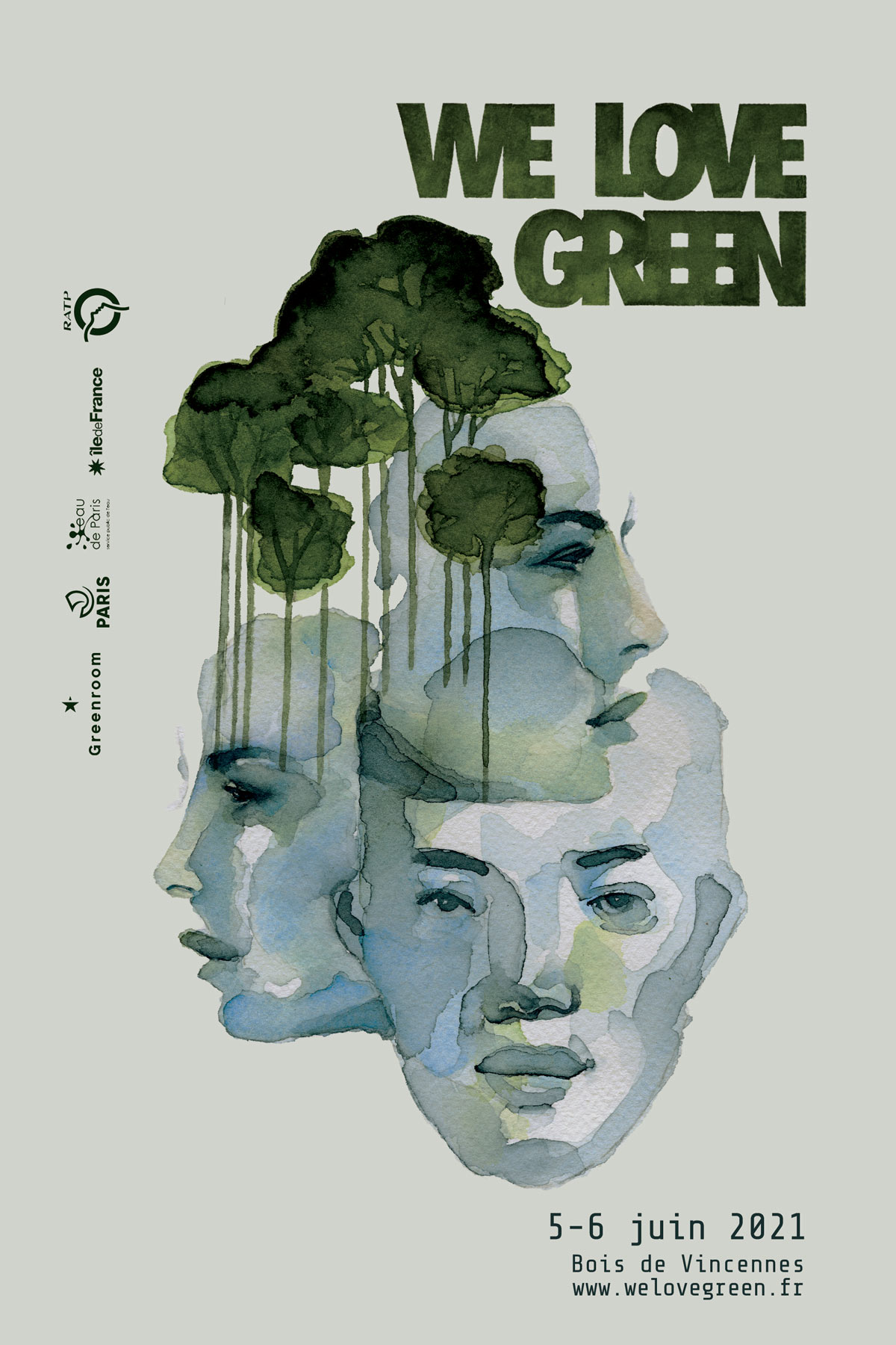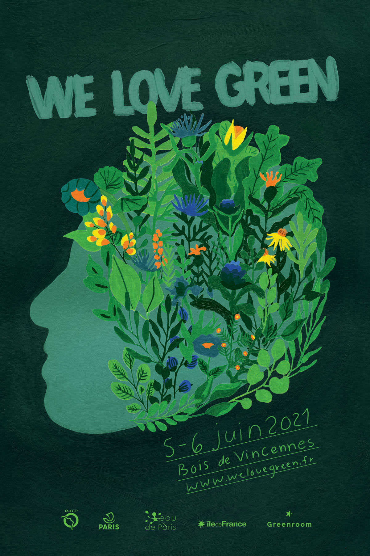 J’ai réalisé deux affiches sur les thèmes du numérique, du virtuel et de l’amour pour la nature. Les affiches représentent l’interconnectivité, les rencontres et l’expérience individuelle et collective que le festival We Love Green propose de vivre.