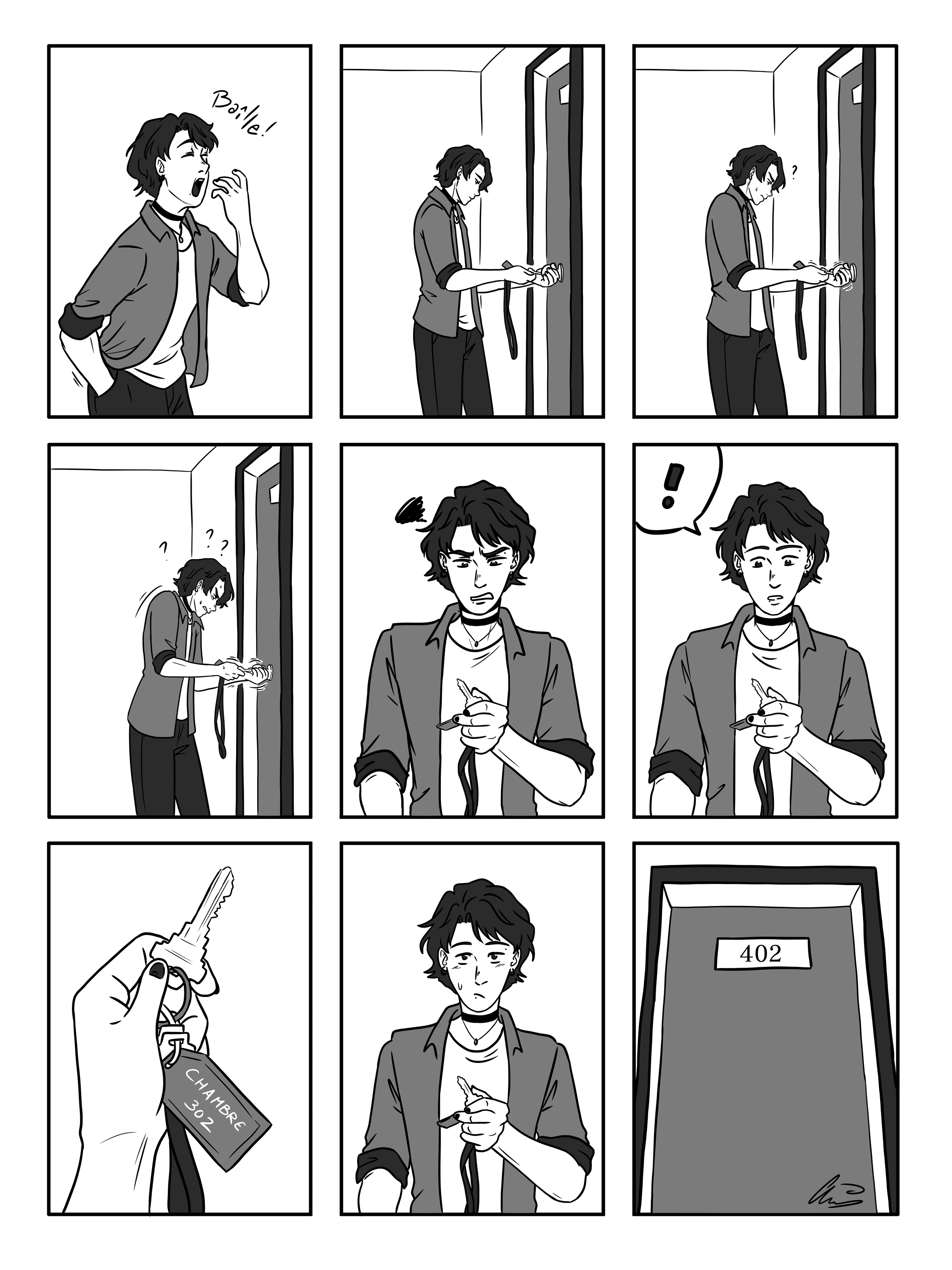 Cette planche fait partie d’une série de courtes blagues mettant principalement en scène deux meilleurs amis nouvellement colocataires. Ceux-ci réalisent rapidement qu’ils s’entendent moins bien lorsqu’ils doivent partager leur espace. La plupart des blagues concernent les bêtises du personnage principal, Théo.
