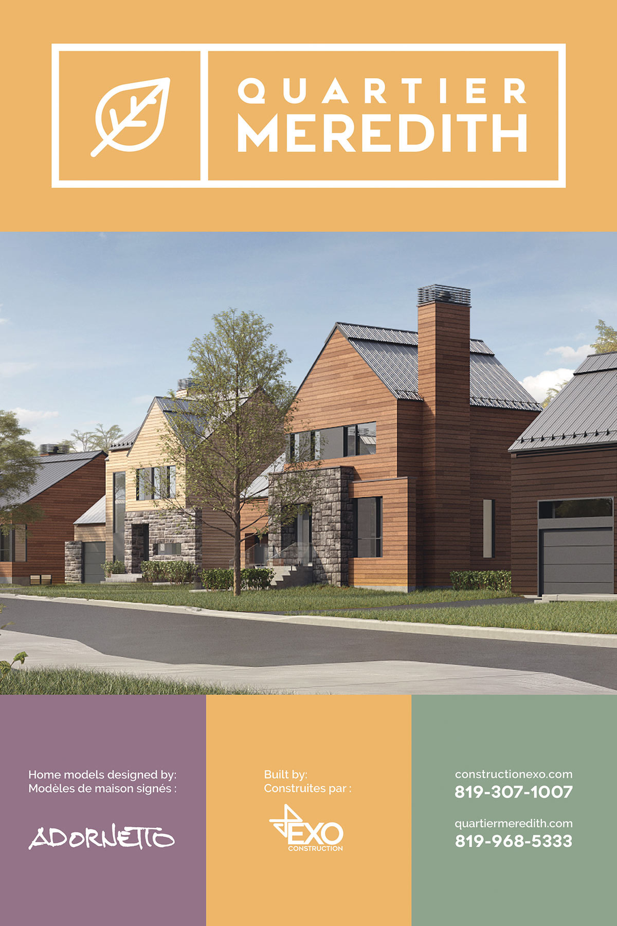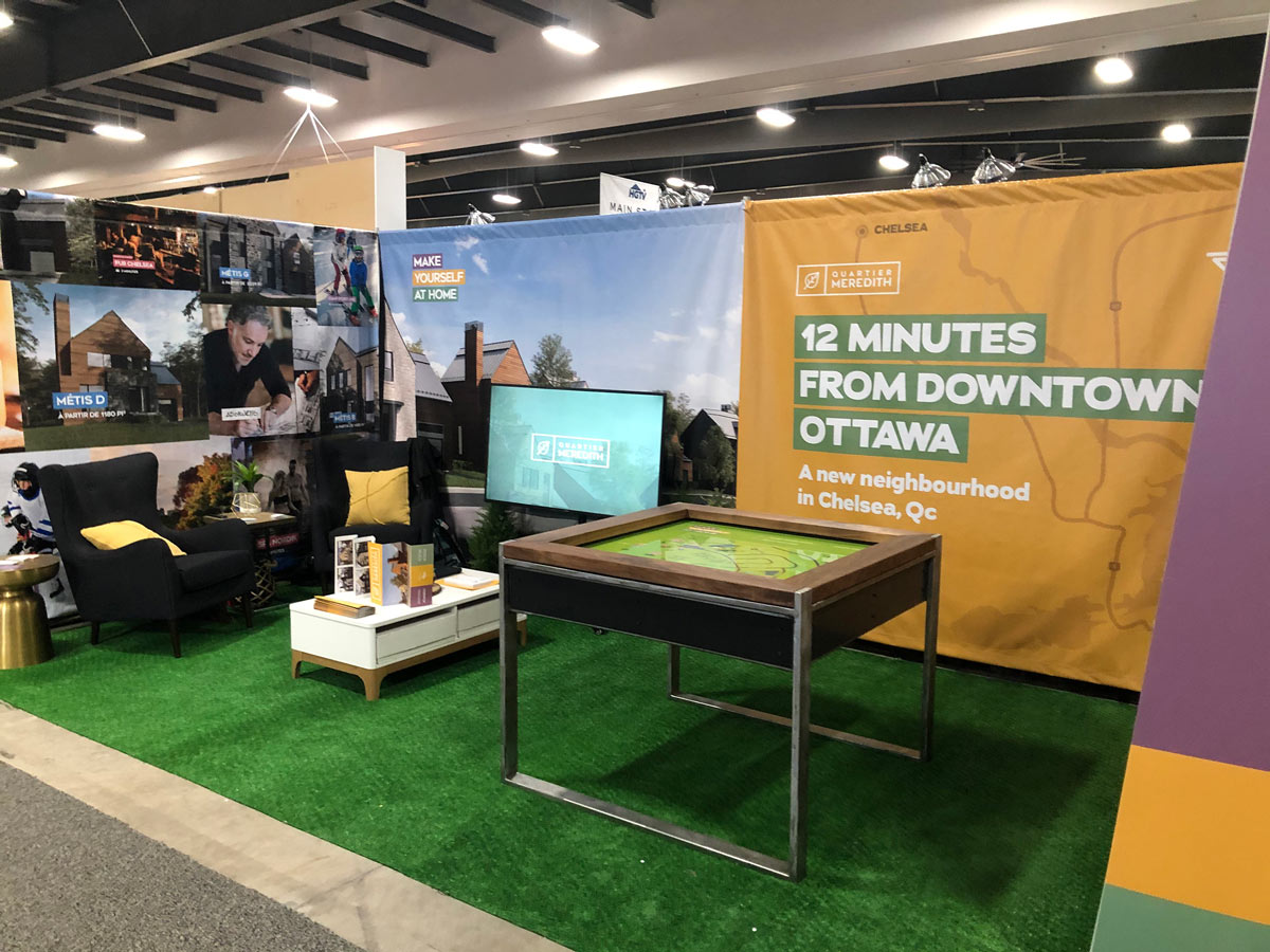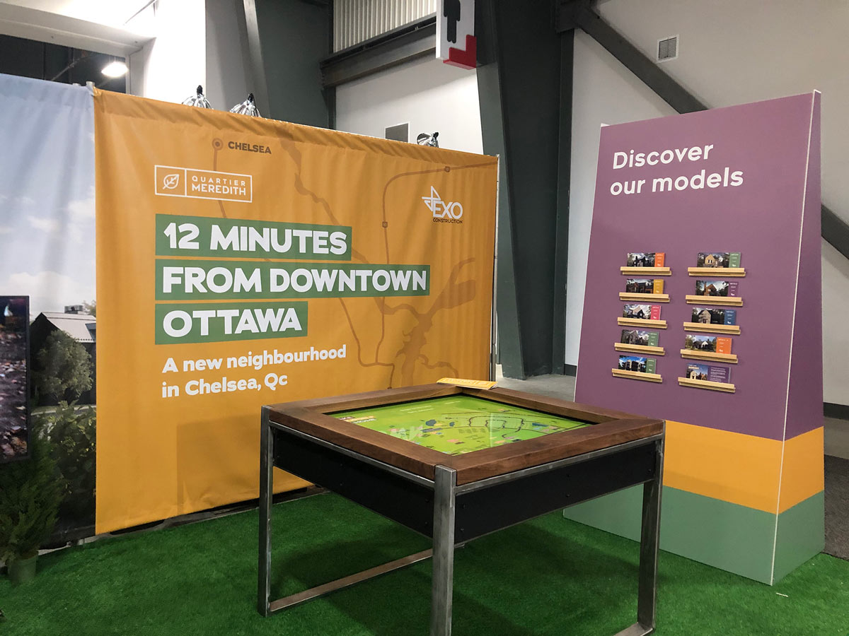 Espace et présentoir conçus pour le Ottawa Home Show où Exo Construction est en partenariat avec Quartier Meredith de Chelsea. Gagnant du prix Best use of Medium Space