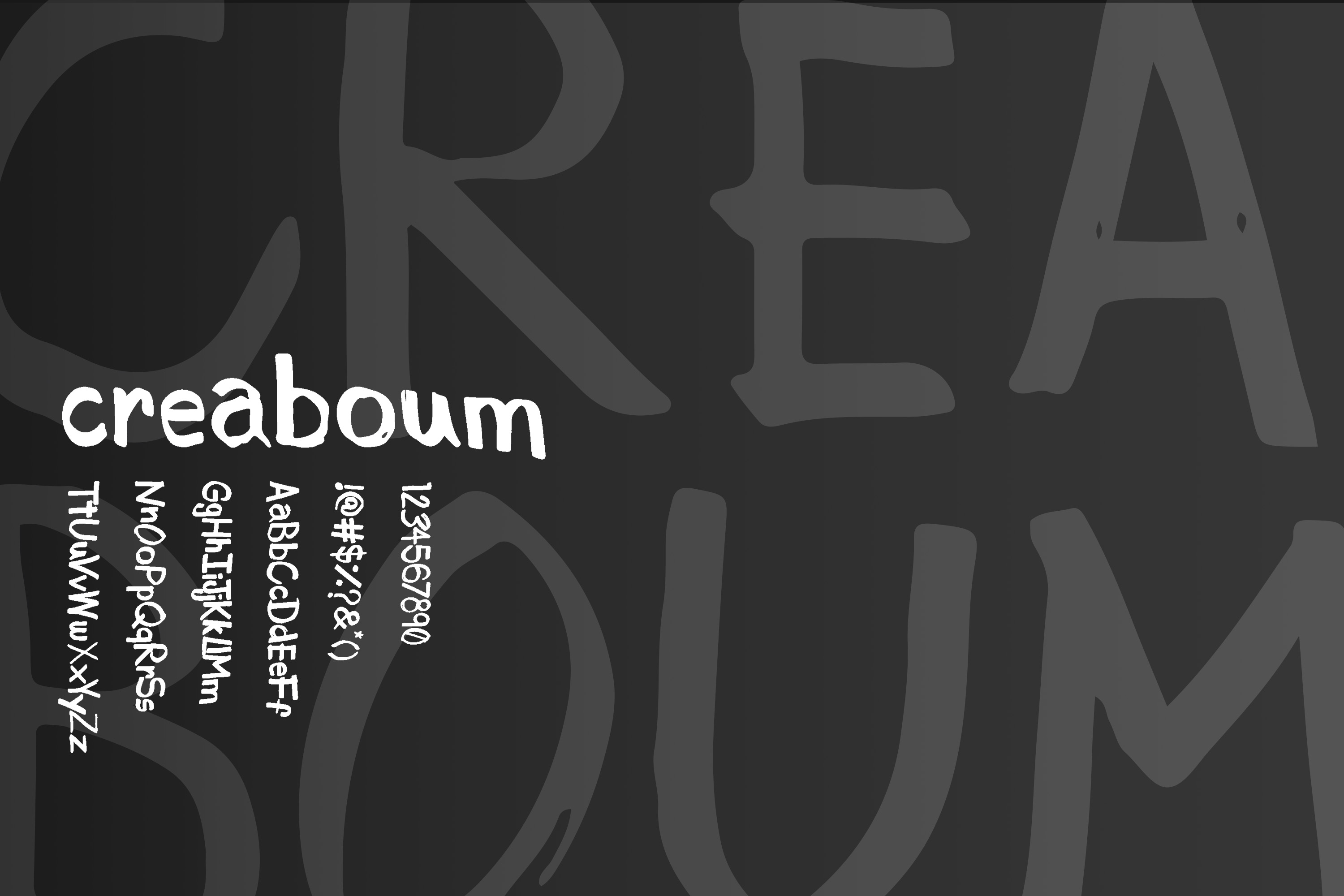 Une typographie manuscrite créée à partir de caractères dessinés au crayon-feutre, numérisés, puis ajustés dans le logiciel FontForge. La dernière version (2025.01.01) de Creaboum comprend 110 glyphes. Elle offre une solution rapide pour apporter une touche « trash » et artistique à vos projets.