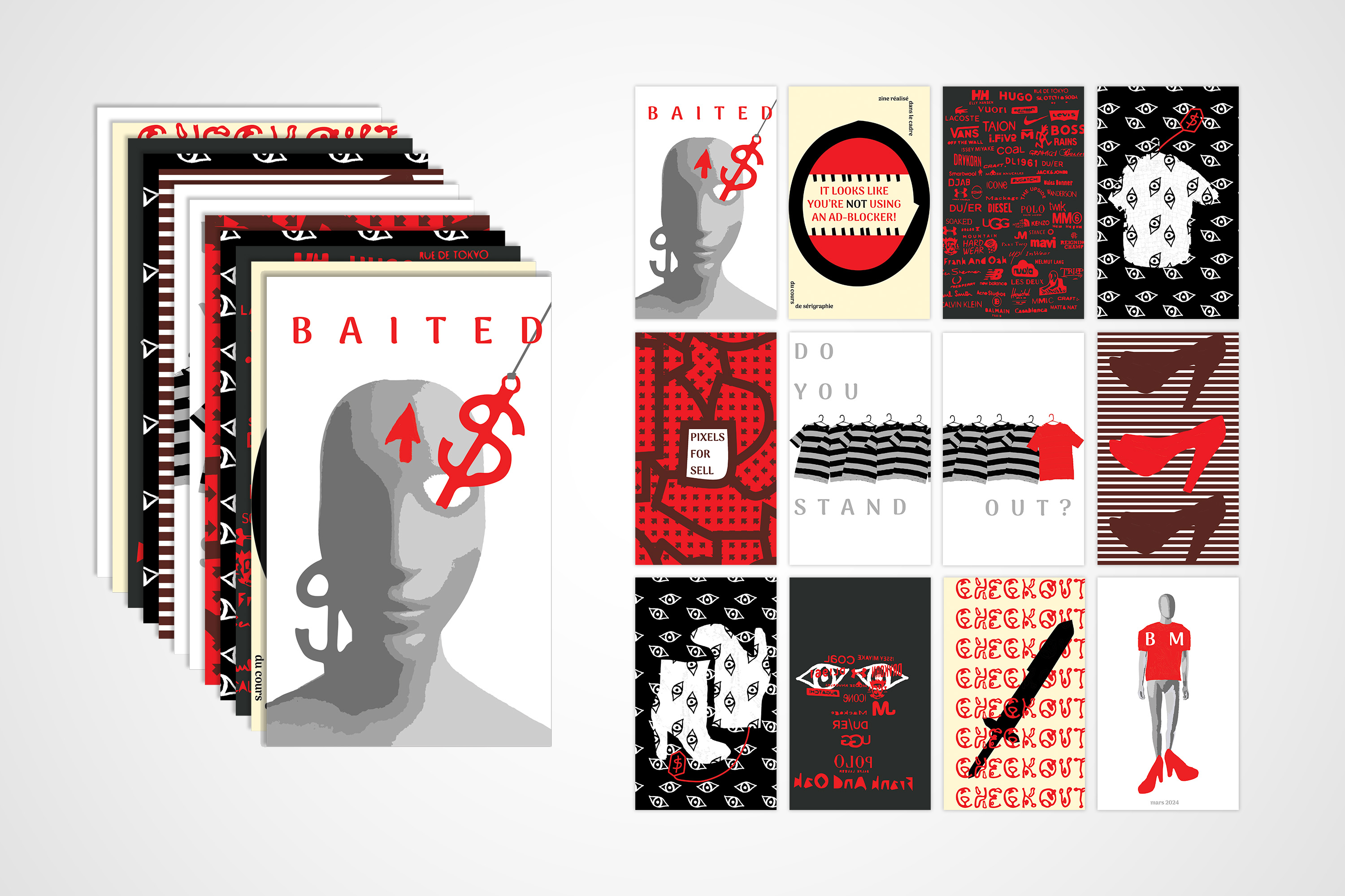 Un livre au format non conventionnel, autoproduit et imprimé en sérigraphie. Cette production incarne un angle critique du capitalisme. Sur la page couverture, l'hameçon en symbole de ‘$’ dans le crâne donne le ton aux thèmes de l'intrusion dans la vie privée et de l’identité du consommateur·rice. Son feuilletage est supposé révéler une expérience vulgarisée de la société de consommation. Comme l’individu est ce qu’il consomme, les logos qu’il voit finissent toujours par le recouvrir.