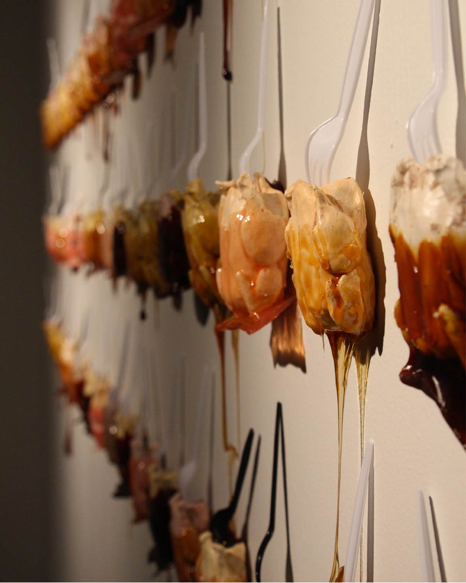 Je m’intéresse aux problèmes créés par la surconsommation, plus particulièrement la surconsommation alimentaire, responsable de souffrances, de stress, de maladies et de pollution. Pour la réalisation de mes projets, je recours à des procédés d’hybridation qui, par la distorsion et la recombinaison de matériaux incompatibles à leurs états naturels, exposent le caractère grotesque du monde créé par les humains. En utilisant des matériaux organiques, non polluants, en optant pour le foisonnement et la répétition (comme dans l’élevage industriel) et en opposant des matières et des savoirs, je tente de provoquer avec humour une réflexion sur l’horreur de nos choix alimentaires.