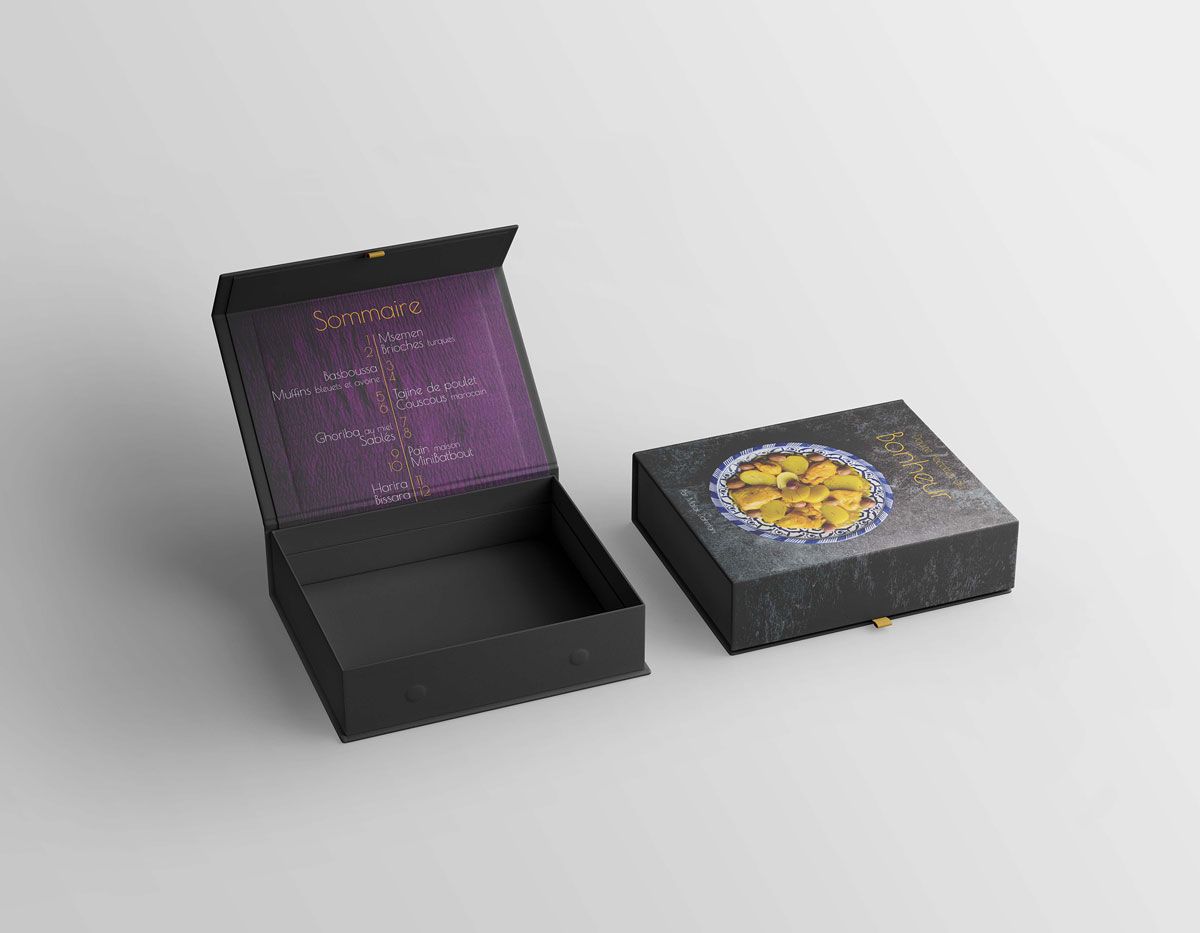 Ce projet est un livre personnel. C’est un guide, une source de références où j’ai archivé mes recettes pour les partager avec mes proches et pourquoi pas avec le monde entier! C’est un livre coffret de format 8 x 10 pouces, qui contient des cartes verticales de 9 x 7 pouces. Ces cartes sont résistantes et faciles à manipuler et à placer sur un plan de travail ou comptoir.