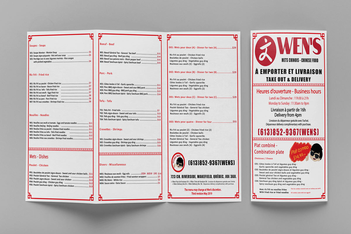Wen’s Chinese Food est un restaurant de mets chinois à Wakefield. Le mandat consistait à créer un logo, un menu, une illustration ainsi que des accessoires divers. Le logo du restaurant présente le nom du propriétaire en caractères chinois. La palette de couleurs privilégie le rouge, allié au jaune et au noir.