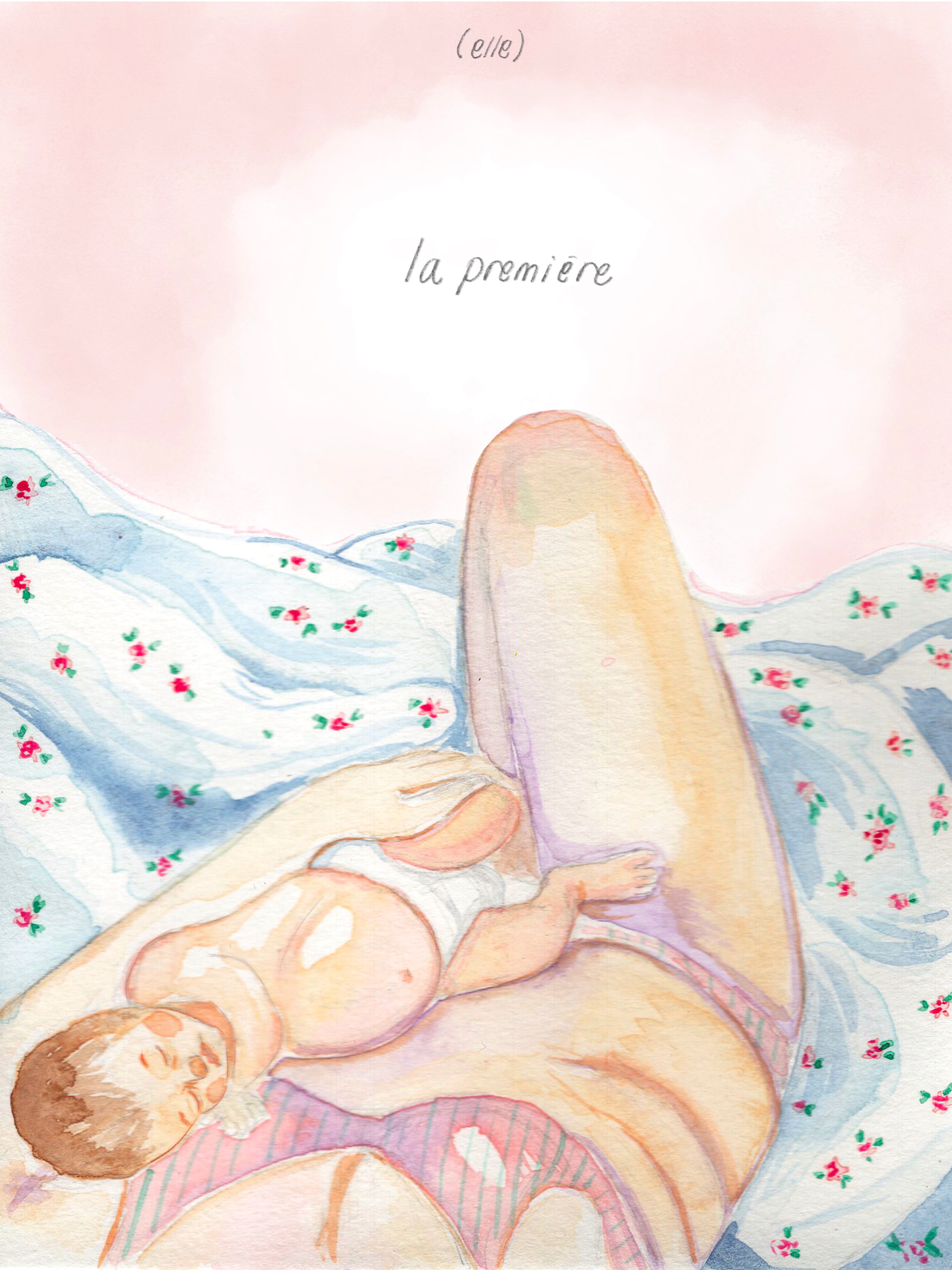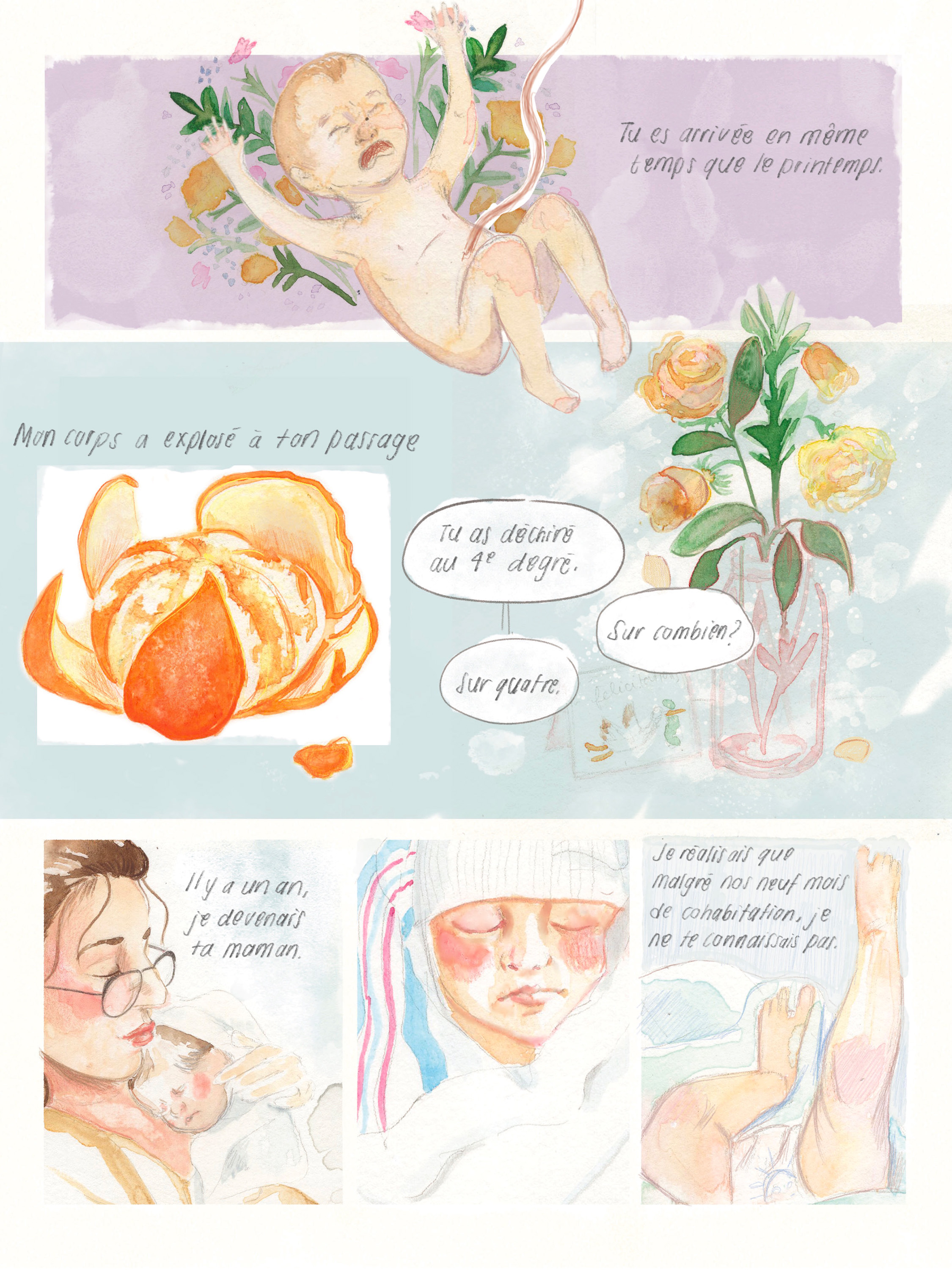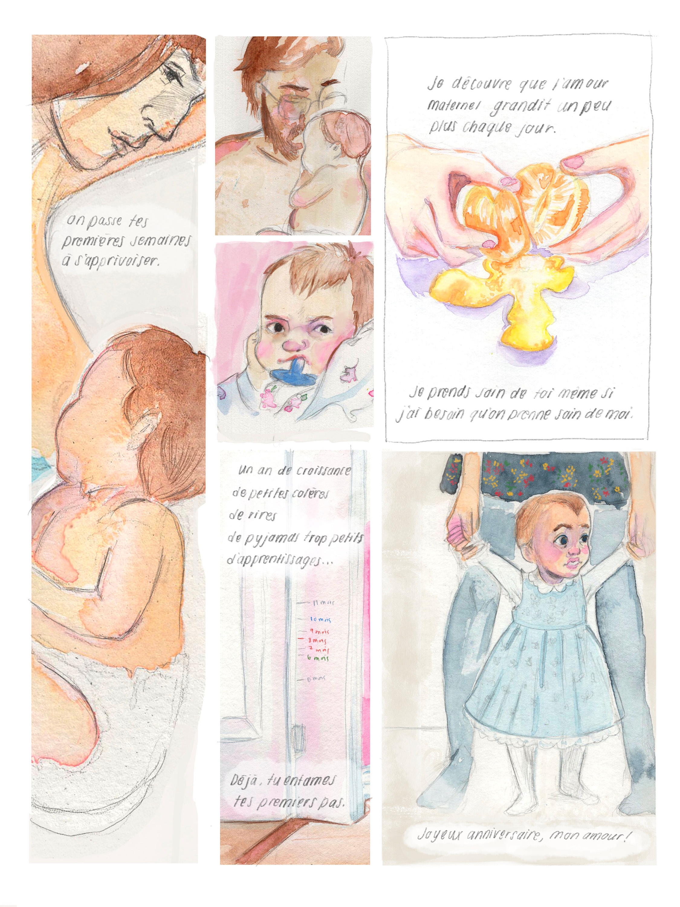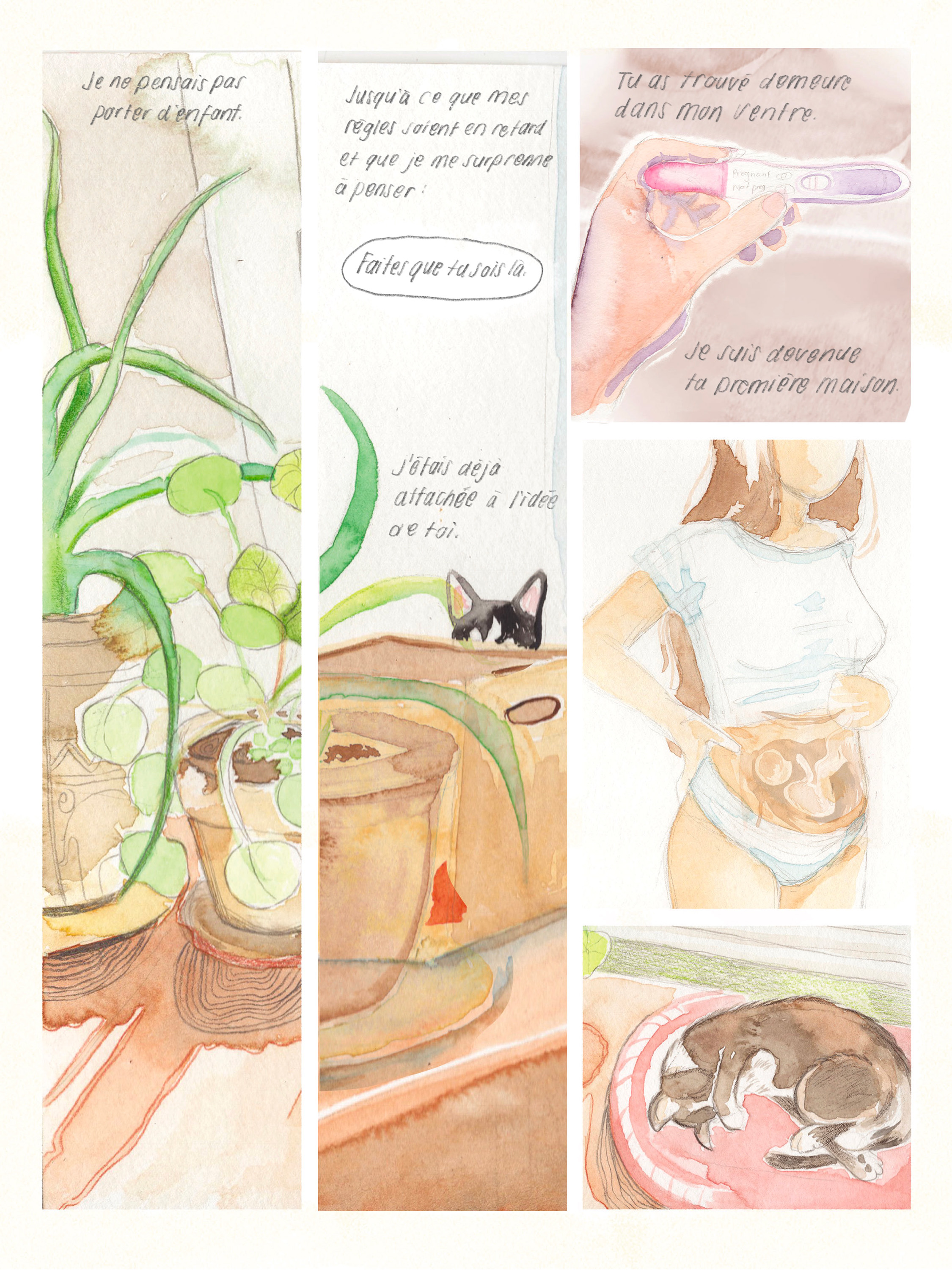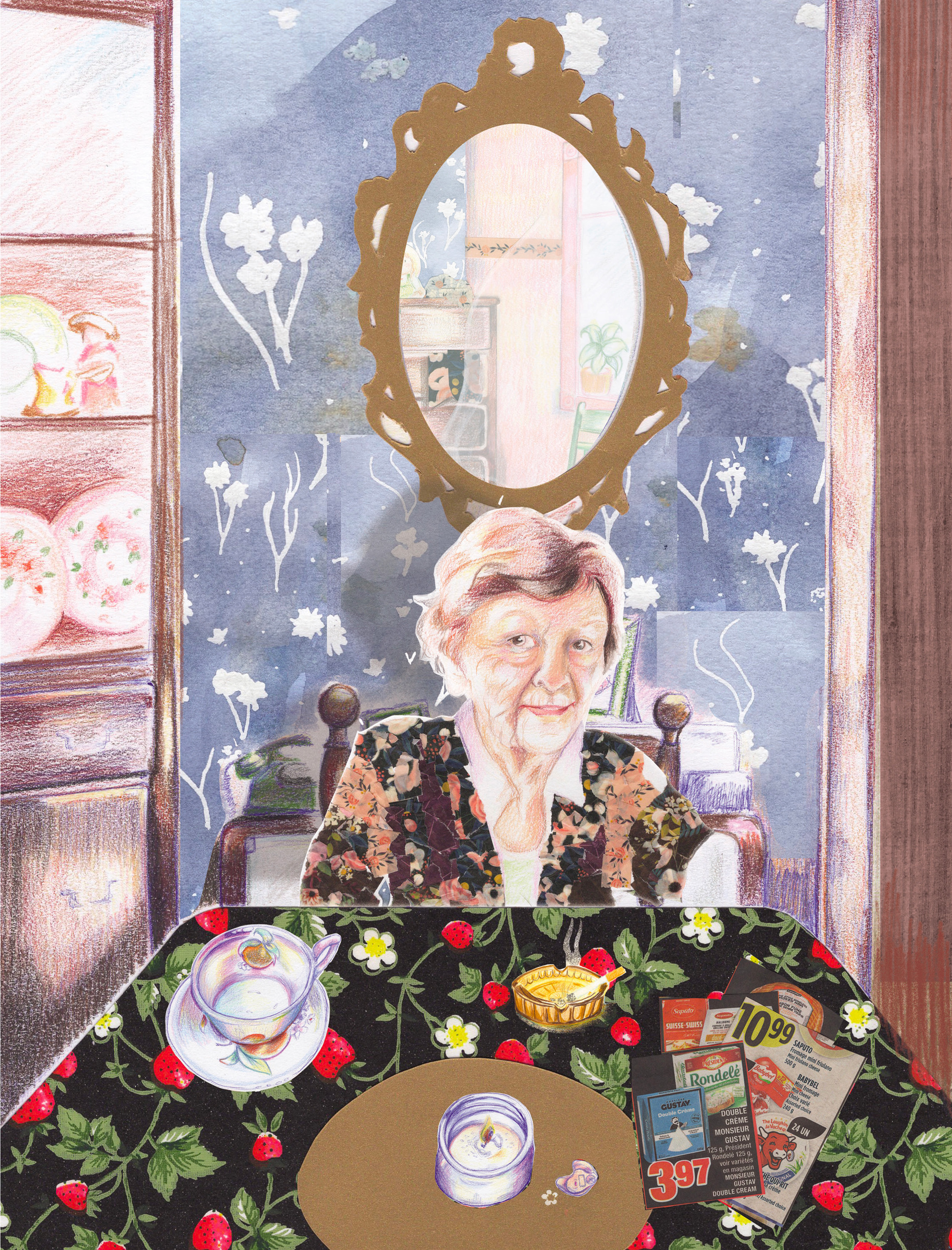 Chez mémé. Collage, crayons de couleurs et aquarelle.