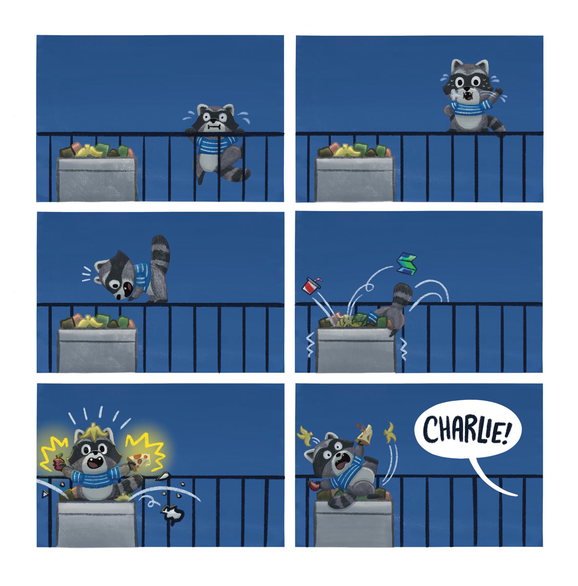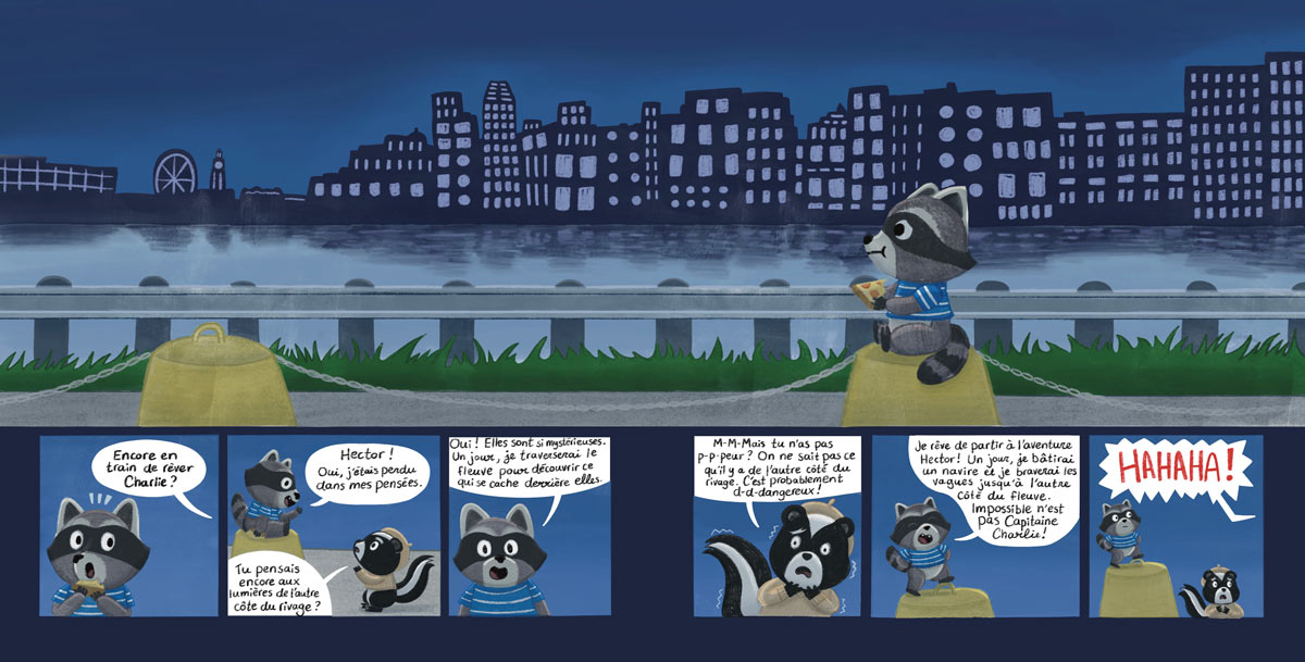 Projet synthèse en bande dessinée racontant l’histoire de Charlie, un raton laveur habitant à La Ronde, qui a comme rêve de traverser le fleuve St-Laurent pour découvrir ce qui se cache derrière toutes les petites lumières qui illuminent le ciel chaque soir. Un récit sur l’importance de persévérer et réaliser ses rêves.