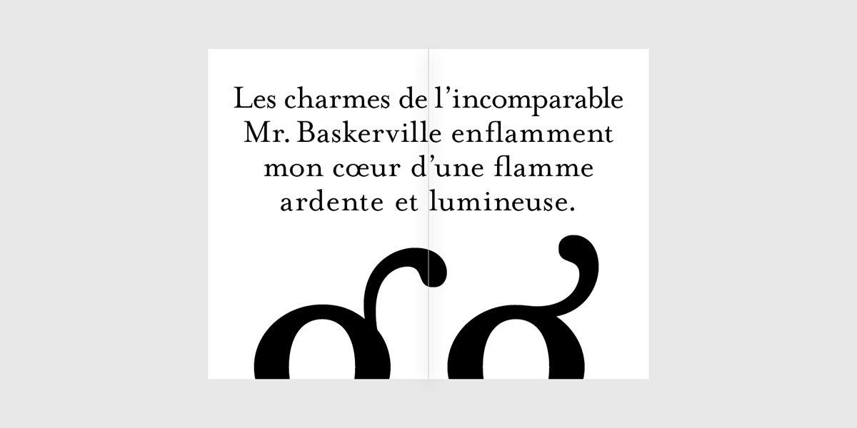 Cette publication met en valeur la police Mrs. Eaves. L’histoire d’amour entre Sarah Eaves et John Baskerville est transposée dans la relation entre les polices de caractères. J’ai choisi de concevoir un journal intime, recueil de poèmes fictifs où Mrs. Eaves exprime ses sentiments envers Baskerville.