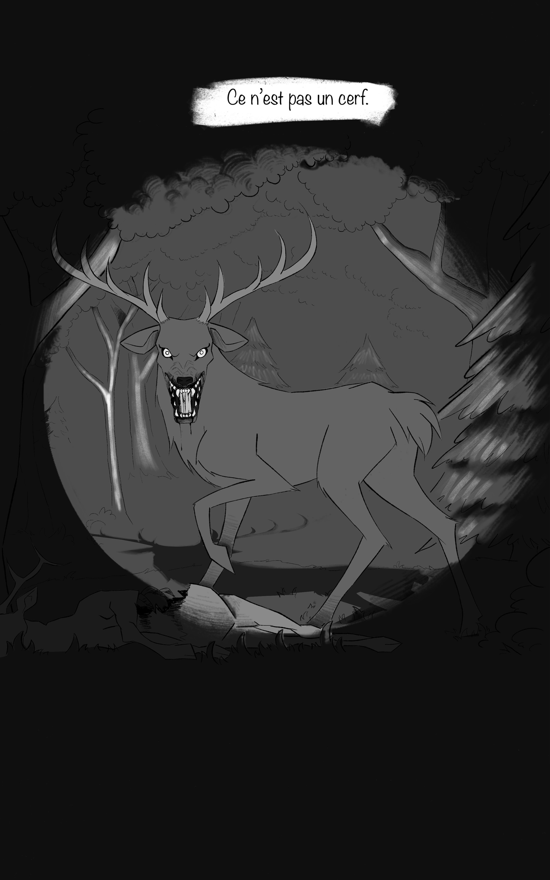 Extrait d’une BD d’horreur courte faite pour l’anthologie Phylactère. J’ai basé l’histoire sur une légende urbaine populaire aux États-Unis, le cryptide Not-Deer, littéralement, le Pas-Un-Cerf.