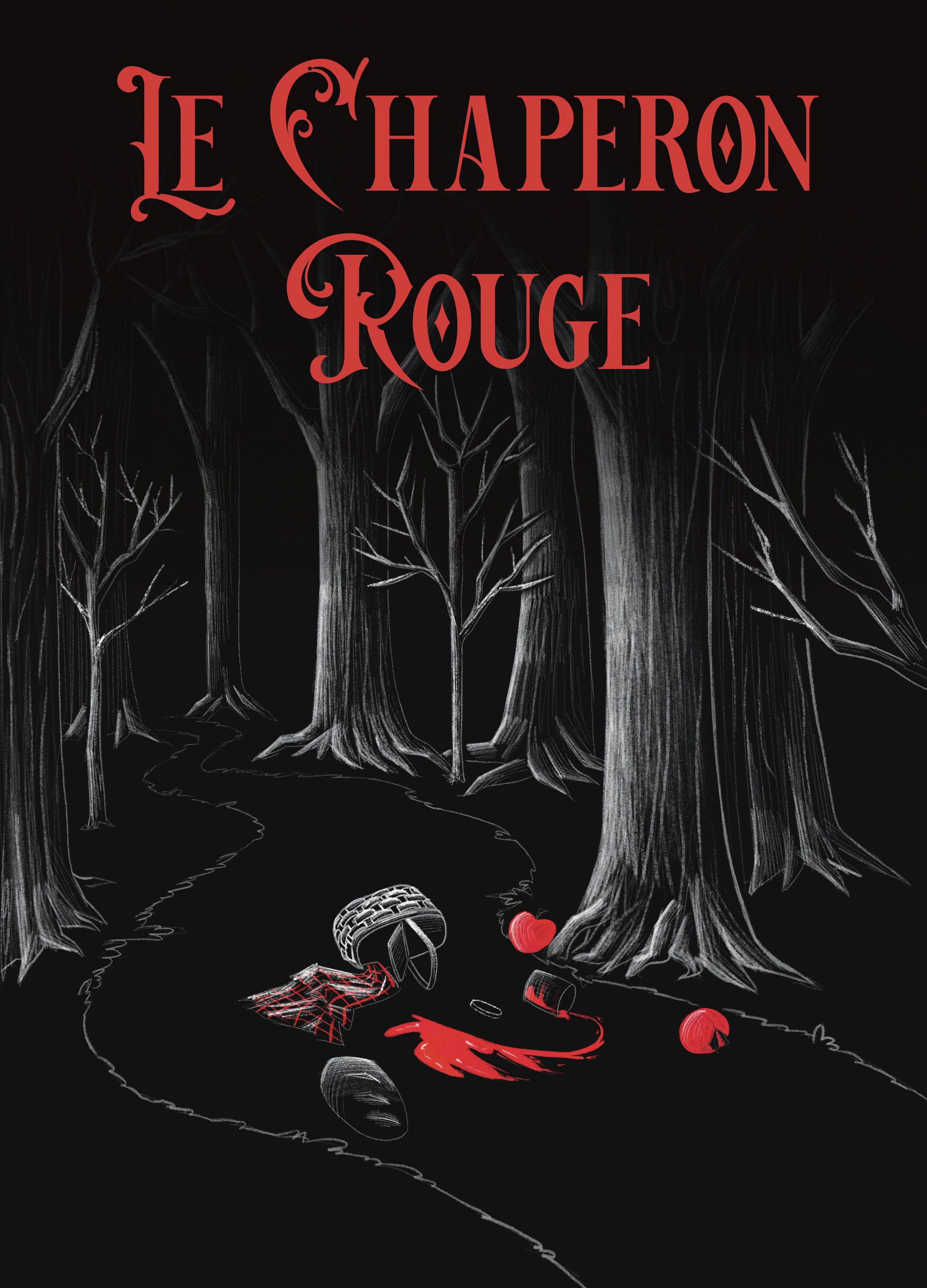 Une couverture pour une version réimaginée du Petit Chaperon Rouge. Assez facile de s’imaginer ce qui est arrivé sans que j’aie à le montrer— et à mon avis, c’est ce qui fait le plus peur.