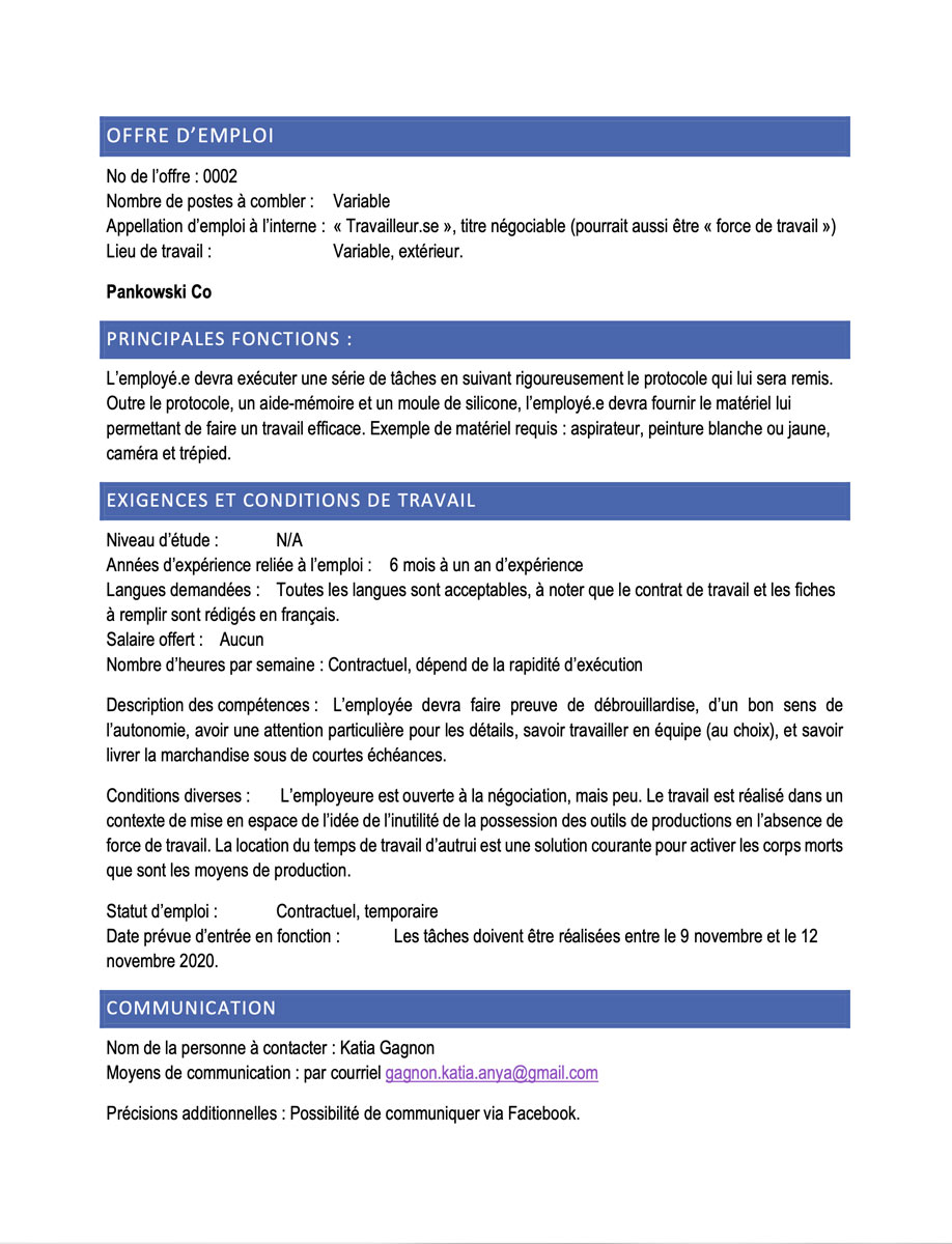Installation réalisée pour mettre en espace l’idée d’inutilité de la possession des outils de production en l’absence de force de travail. La location (le vol) du temps de travail d’autrui est la solution pour activer les corps morts que sont les moyens de production.