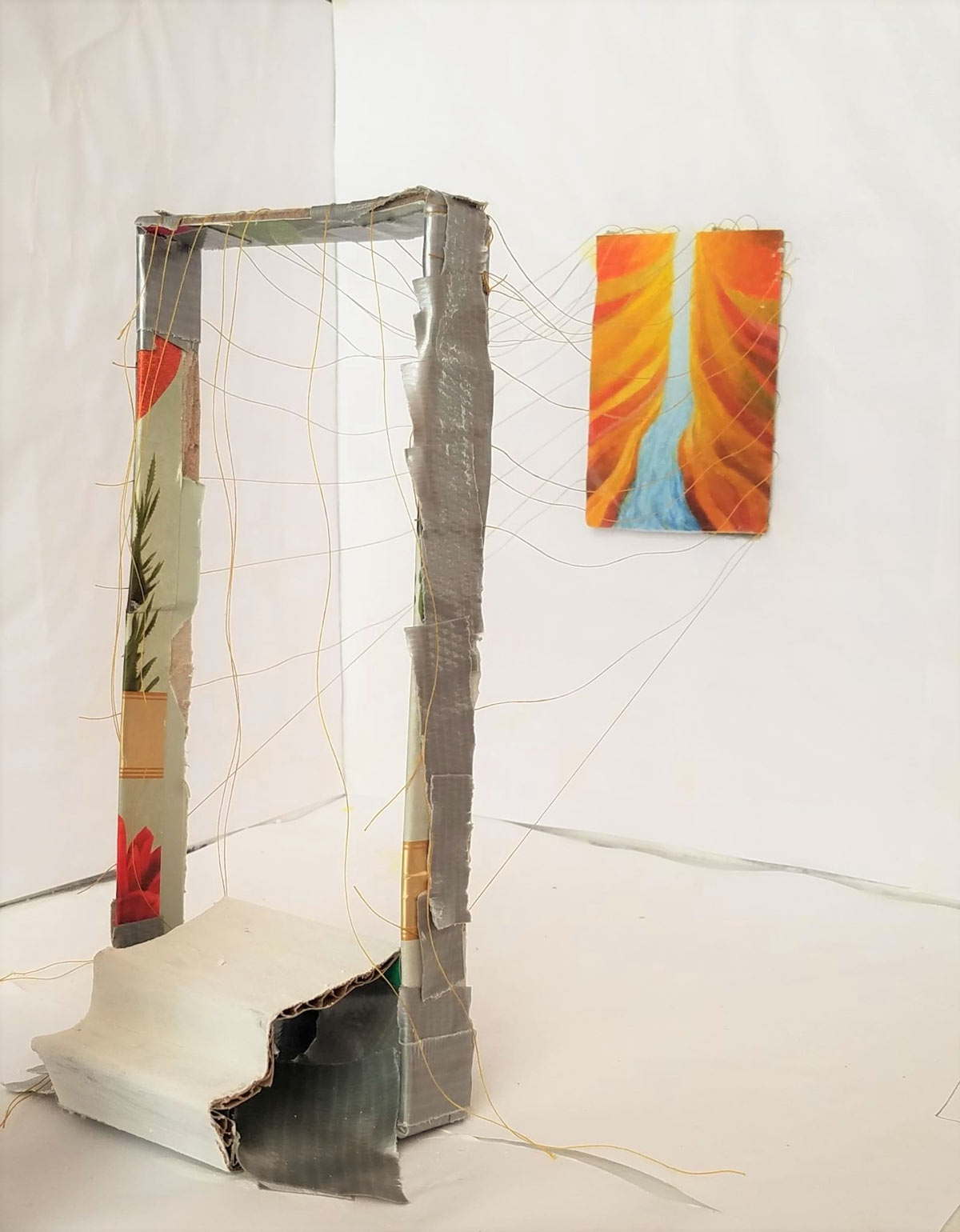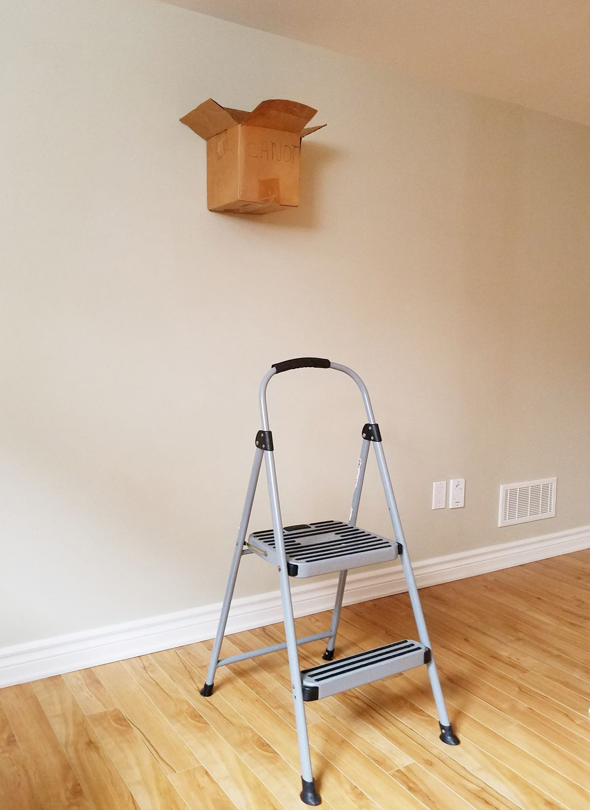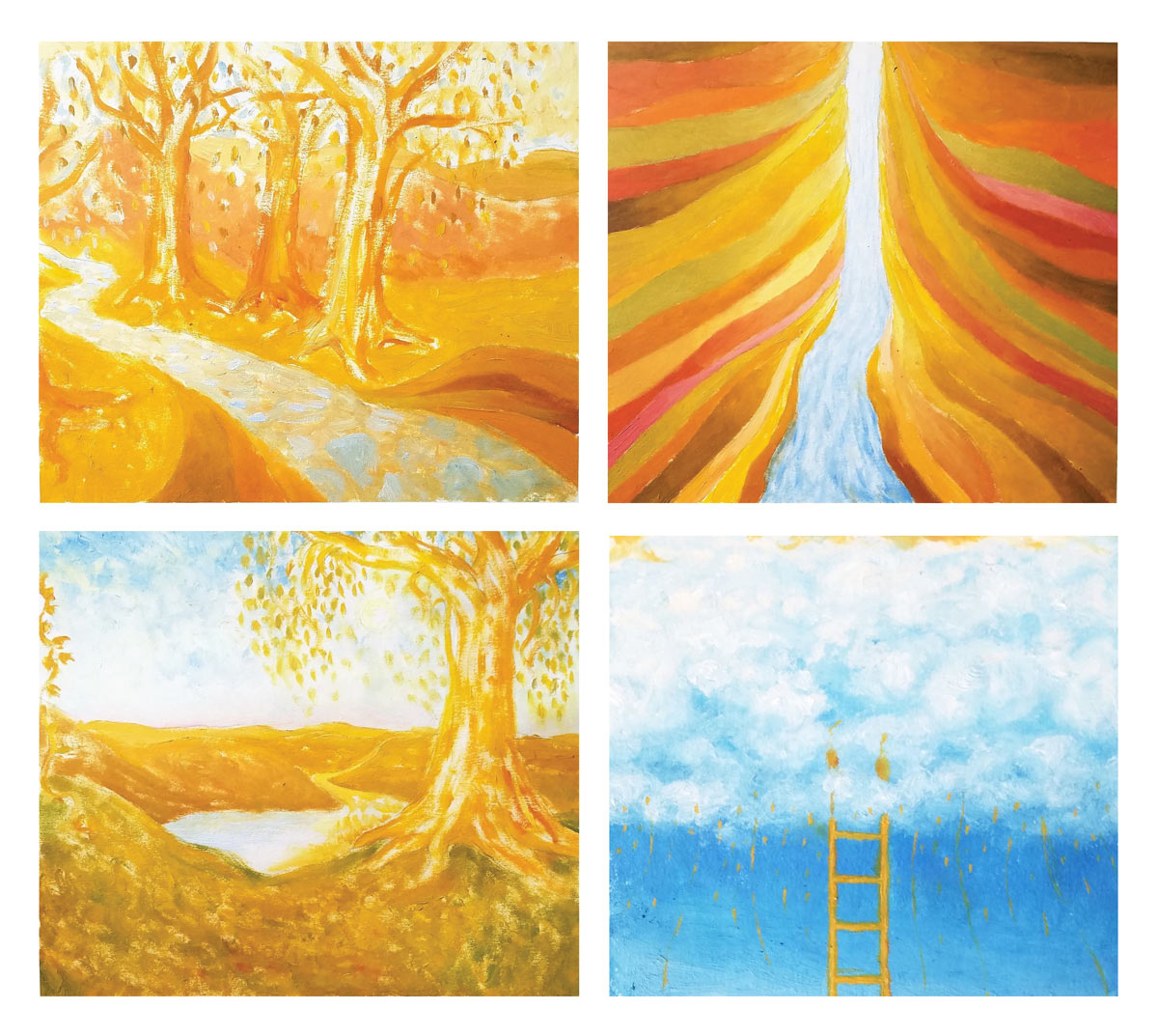 J’imagine un petit carnet contenant sept petites peintures, une boite en carton en haut d’un escabeau, quatre mots: ce n’est pas fini. J’imagine un lieu secret, en hauteur, qui atteint le Ciel, les nuages, la présence de Dieu. Un point de rencontre dans l’élévation. Un point de rencontre entre la spiritualité et l’art.