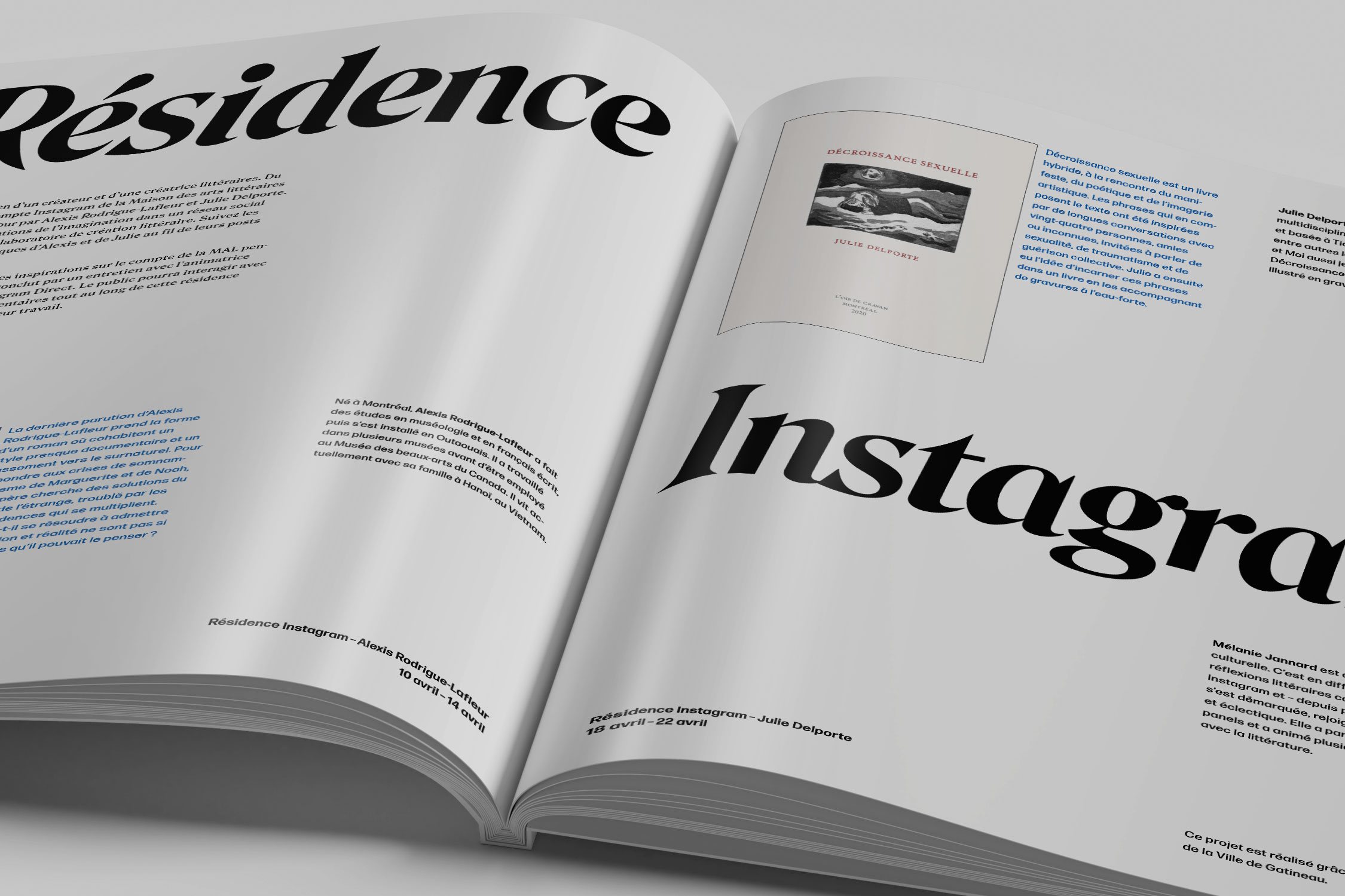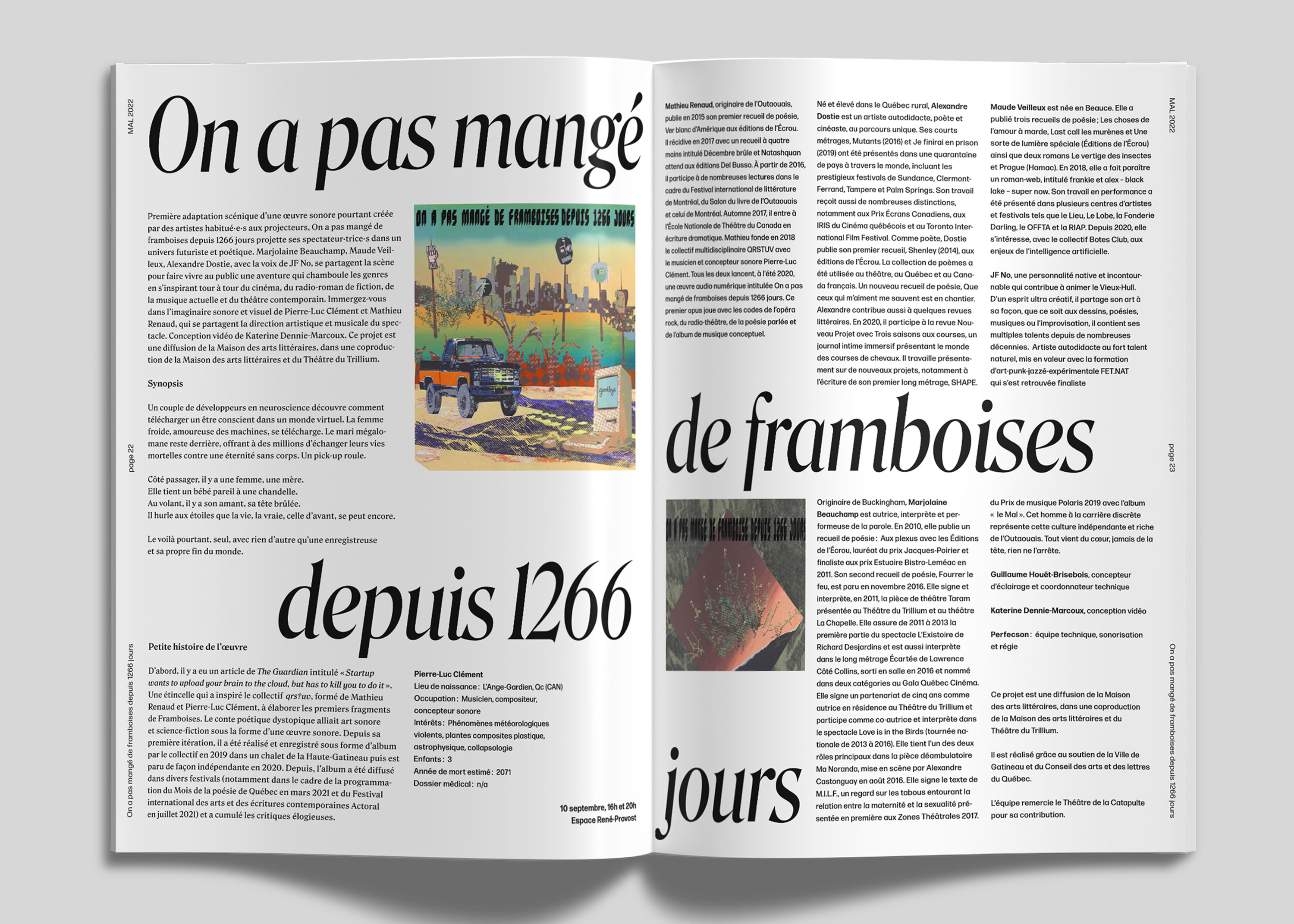 Publication pour la Maison des arts littéraires (MAL) de Gatineau. Cette dernière célèbre l’ouverture et la diversité tout en encourageant l’exploration et la transcendance des frontières de la création littéraire. S’inspirant de ces valeurs fondamentales, le design de la publication adopte des compositions asymétriques et des contrastes saisissants, tout en accordant une importance particulière aux noms des auteurs, des artistes et des organismes partenaires impliqués dans chaque projet.