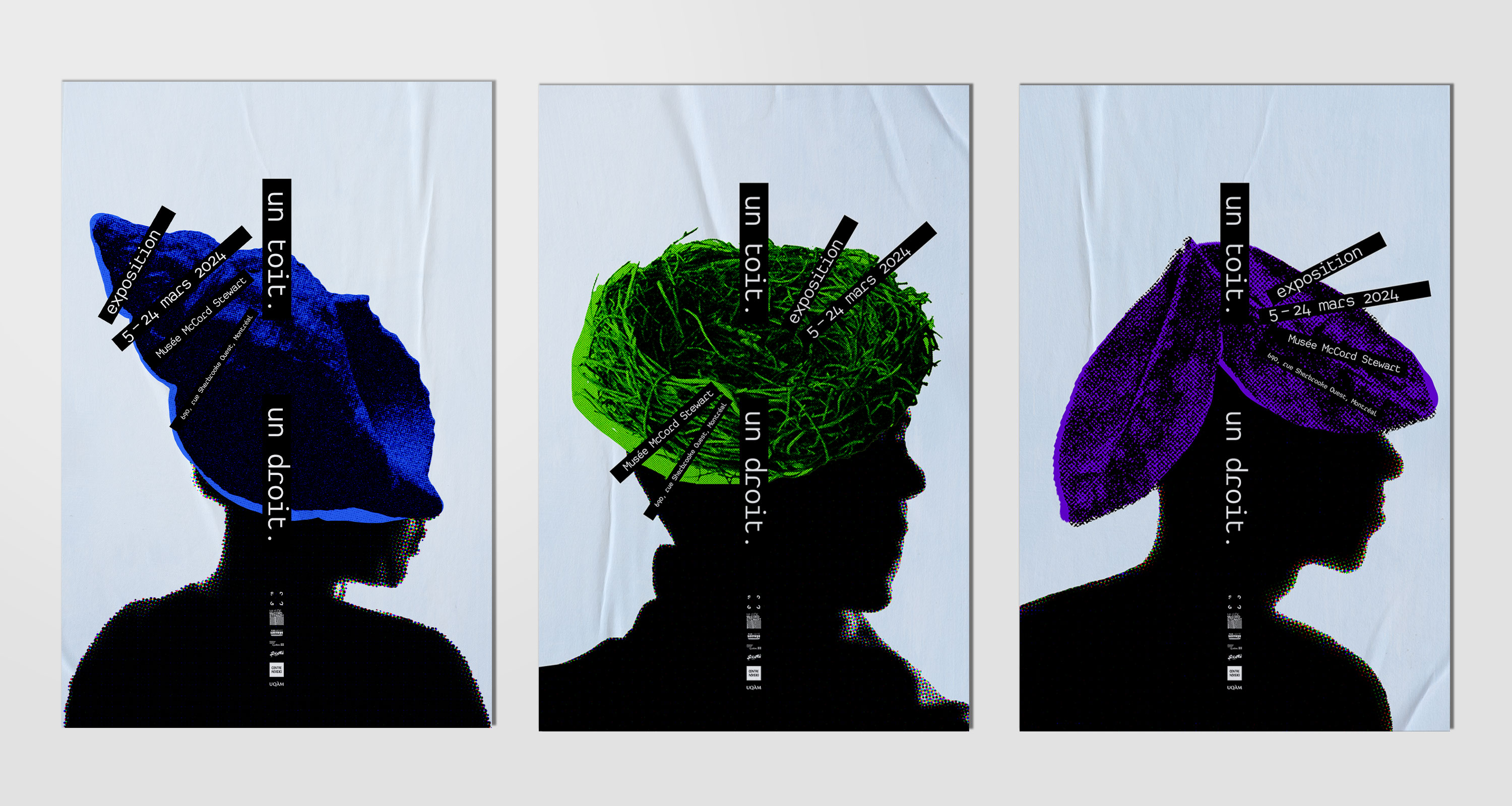 Série d’affiches conçue pour le concours Marc H. Choko, organisé par la Société des designers graphiques du Québec et le Musée McCord Stewart, en partenariat avec le Front d’action populaire en réaménagement urbain (FRAPRU), autour du thème « Un toit. Un droit. ». Cette série explore, de manière sensible, l’inaliénabilité du droit au logement, le représentant comme une composante essentielle de l’anatomie même des personnages.Affiches retenues pour faire partie de l’exposition au Musée McCord Stewart, du 12 au 31 mars 2024.