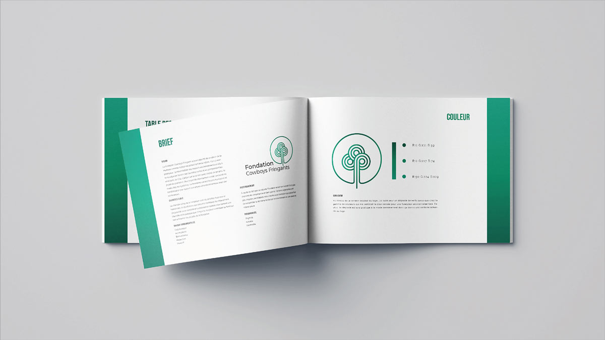 Pour le projet de la Fondation Cowboys Fringants, nous avions pour mandat de revamper l’image de marque désuète de l’organisation. La mission de la fondation est de collaborer avec le milieu culturel québécois pour agir concrètement face à l’urgence climatique. En versant une part des profits issus de la vente de billets de spectacle, les artistes participants contribuent à la plantation d’arbres comme levier d’action puissant pour la captation du carbone. Mon logo représente un arbre en croissance qui fait allusion à la mission de la fondation. Le cercle qui l’entoure incarne l’union entre le domaine culturel québécois et les fans qui participent au projet en achetant des billets. Le dégradé de vert incarne le thème de la nature et donne une touche contemporaine au logo. Je suis fier de cette création, car elle a été choisie par la fondation. Ce projet me permet, à ma manière, d’être un des acteurs du changement.