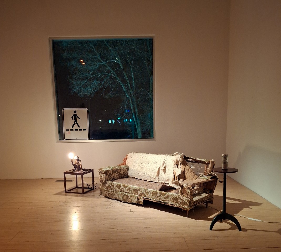 J’explore le souvenir sous un angle autofictif, où j’impose à un objet qui n’est pas le mien, auquel je n’ai aucun vécu attaché, une vie antérieure personnelle. Cet attachement que je crée s’inspire d’un réel attachement à un objet semblable de mon passé. Le sofa fleuri « de grand-maman » est un objet qui incarne une double appartenance. Il appartient à la fois à une mémoire collective et à un vécu tout à fait personnel. C’est à cette mémoire collective que je cherche à développer une connexion.