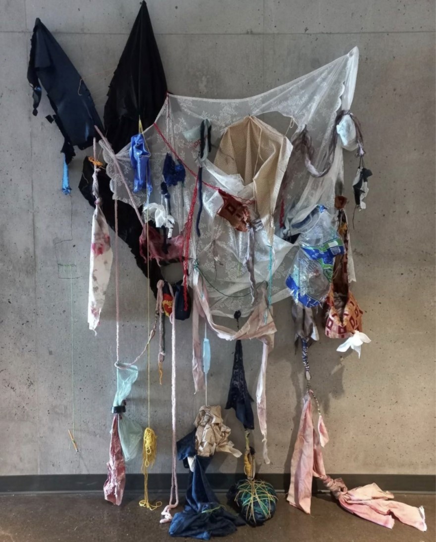 Emma Jacques, Spread, mai 2022, matériaux recyclés (tissus variés, laine, déchets, plastique, fil de broderie), environ 91cm x 198cm