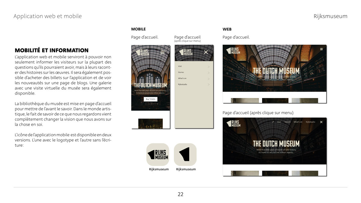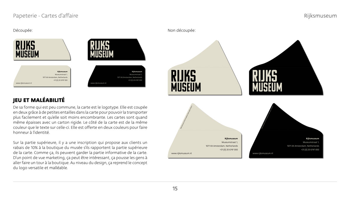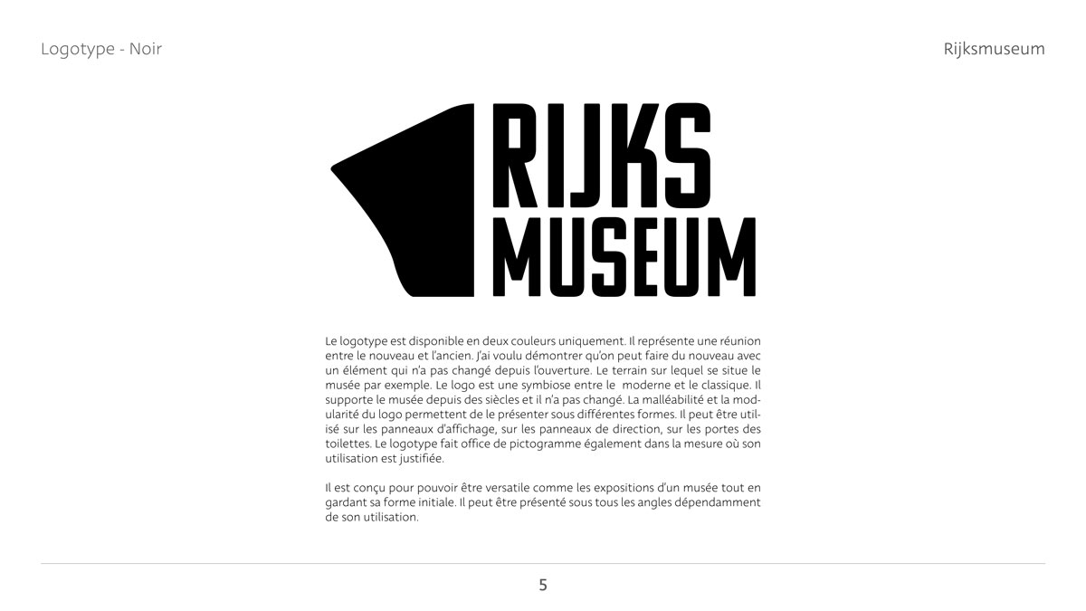 Le mandat initial proposait la création de l’identité visuelle d’un musée existant en s’inspirant d’une de ses caractéristiques architecturales. Le Rijksmuseum d’Amsterdam est le musée des Pays-Bas. Ma proposition utilise une partie du terrain sur lequel il se situe, tout en permettant des déclinaisons originales. Voici trois des 25 pages du guide de normes graphiques qui découle de ce concept.