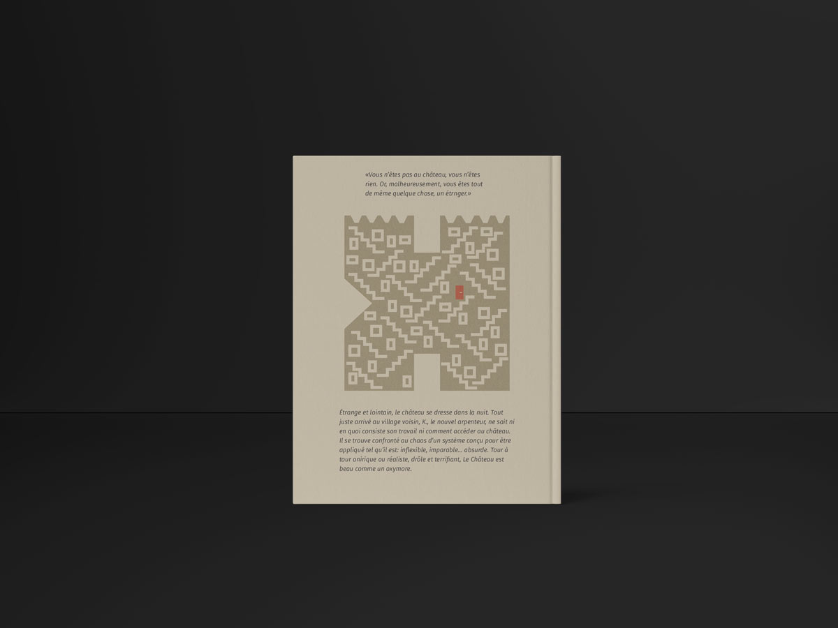 Le mandat consistait à créer la couverture d’un livre en utilisant seulement des composantes typographiques. Mon concept repose sur le thème de la lettre «K» qui est très importante à plusieurs égards dans ce livre. La lettre «K» est la première du nom de famille de l’auteur, mais également le prénom du protagoniste dans le roman. J’ai voulu faire en sorte que la lettre devienne en même temps le château et le personnage principal du livre.