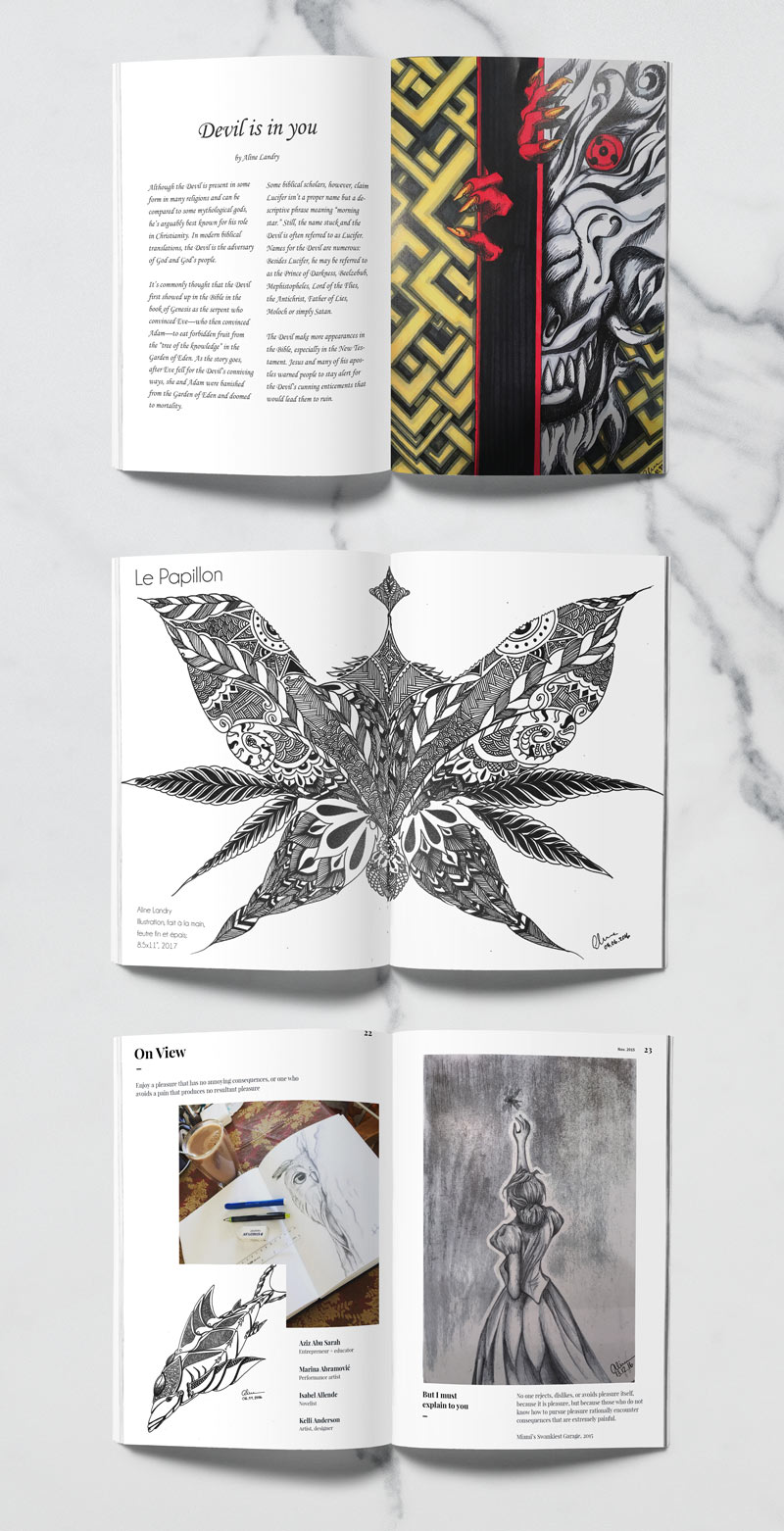 On trouve souvent dans mon travail de l’artisanal, une réalisation au crayon ou au feutre. J’ai le souci du détail. Depuis ma tendre enfance, j’ai toujours été passionnée par le graphisme et l’illustration. Suite à mes multiples formations, je suis aujourd’hui designer graphique.