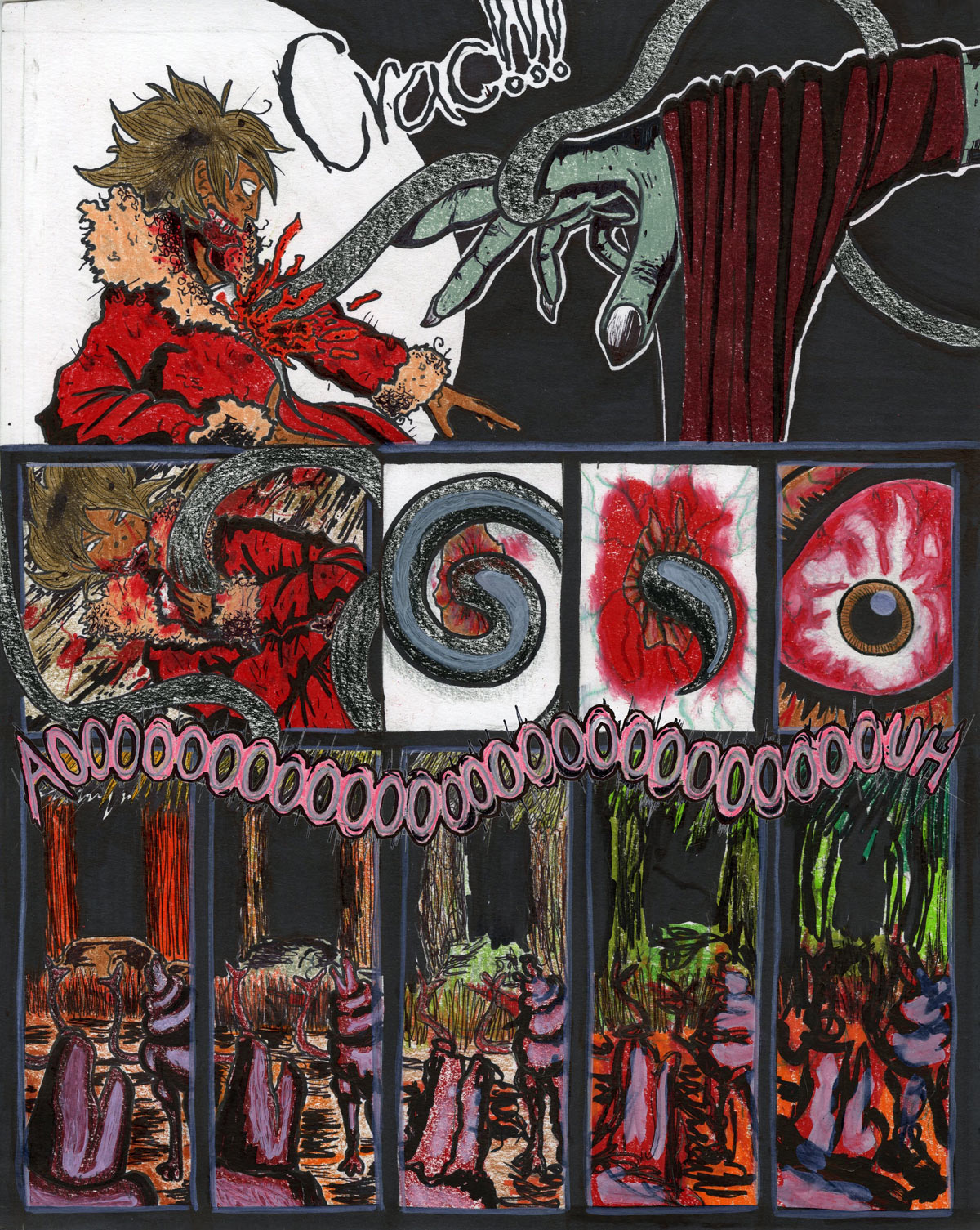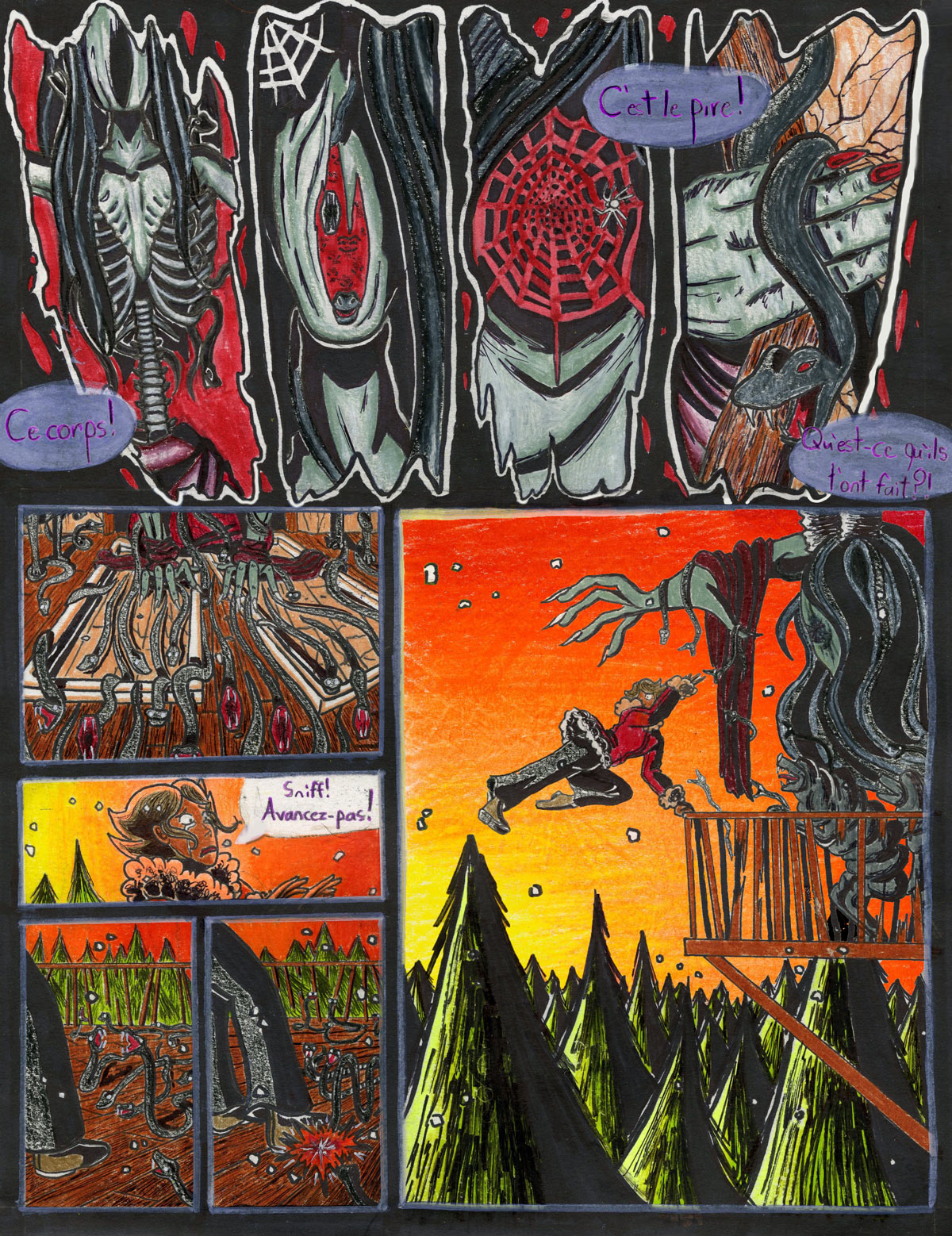 Mon projet synthèse! Quel cauchemar à tout colorier. J’espère que ceux qui porteront un œil au résultat final sentiront l’horreur que je tente d’intégrer sur le papier. En gros, la fin est proche et ma protagoniste s’en sortira vivante, mais étrangère à elle-même.