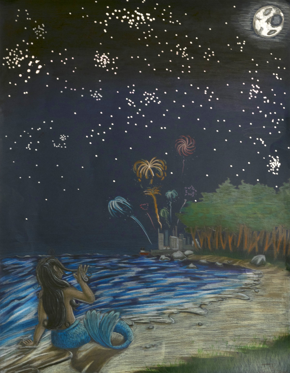 Une Sirène, 2017. 66 cm × 51,7 cm. Crayons de couleurs et acrylique