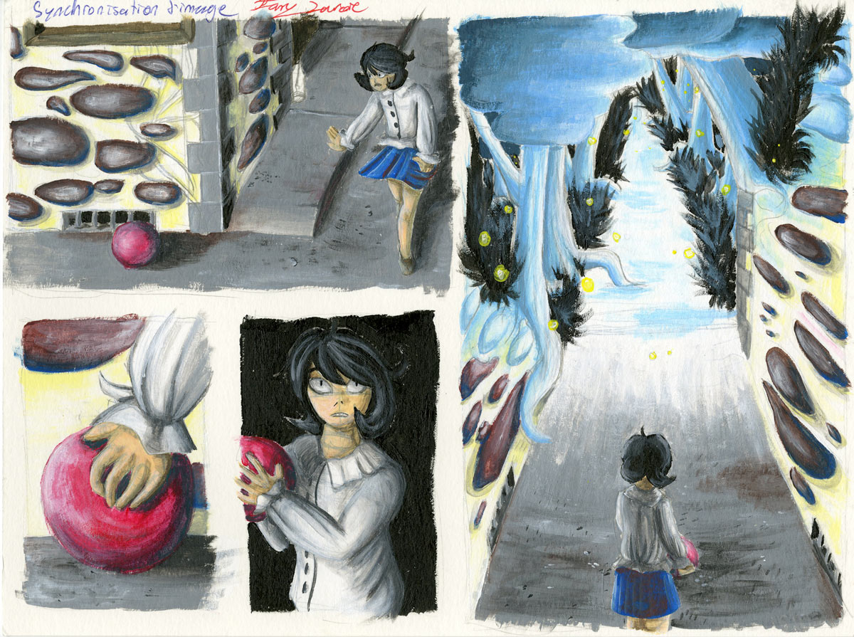 Ce n’est qu’un petit test grossier. Mon professeur de peinture espérait voir du mouvement dans nos œuvres. Je m’y suis appliquée en créant une simple planche de bande dessinée.