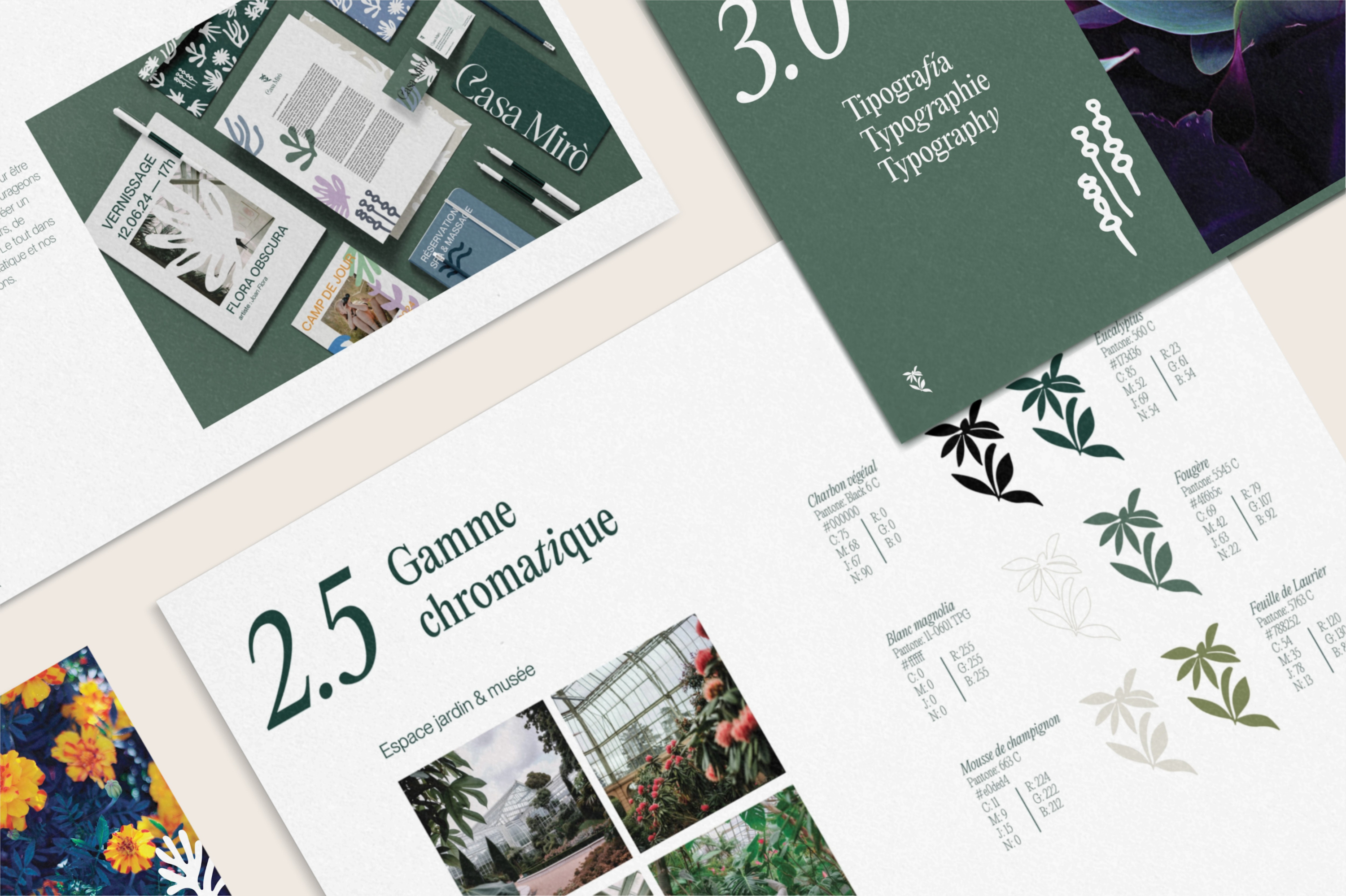 Guide de normes graphiques conçu en 2024 pour Casa Mirò, un projet fictif inspiré des musées et jardins botaniques. L’identité visuelle allie nature, art et architecture à travers une palette végétale et une typographie élégante.