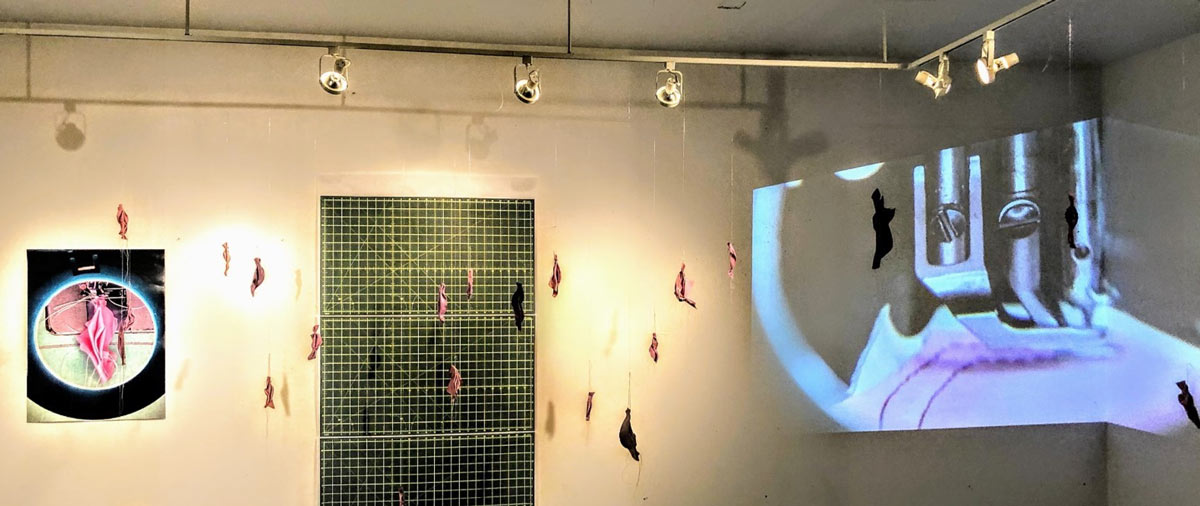Les pressions sociales du genre transforment le corps humain en objet. Ma réflexion sur les altérations et les manipulations esthétiques des parties intimes féminines est le point de départ de cette installation. Les petits objets de cuir, en suspension et par accumulation, la projection du travail à la machine à coudre —tout est en miroir et en confrontation. L’aspect froid et robotique de la machine à coudre contraste avec la matérialité malléable, satinée, souple et tendre du cuir.