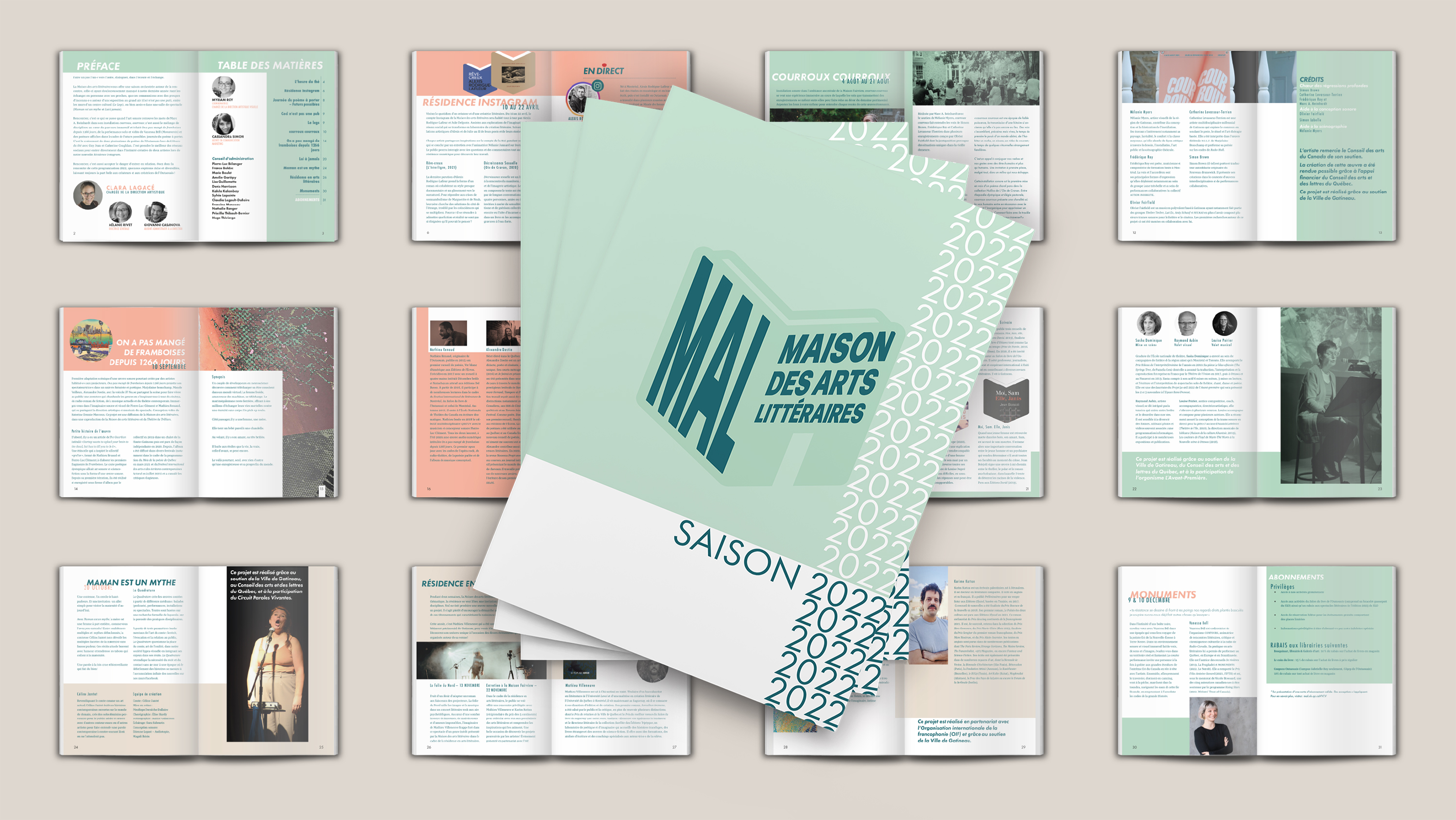 La Maison des arts littéraires (MAL) envisage de publier un magazine pour marquer les événements importants de l’année. Tout en conservant le logo et la palette de couleurs existante, la MAL se cherche une nouvelle esthétique. Mon projet propose une mise en page innovante, reprenant la palette et jouant avec la forme du logo. Pour célébrer les événements, la conception vise à susciter un sentiment festif grâce à un changement de grille de compositions, donnant un rythme dynamique à la lecture du magazine.