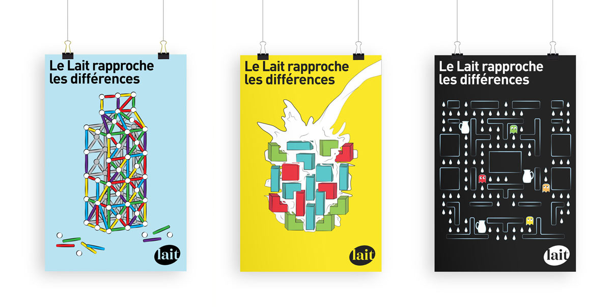 J’ai réalisé une série de trois affiches pour une ancienne campagne publicitaire intulée Le Lait rapproche les différences pour les producteurs de lait du Québec. La représentation du rapprochement, de la différence et l’intégration du lait d’une façon originale étaient obligatoires. J’ai abordé mes illustrations sous le thème du jeu.