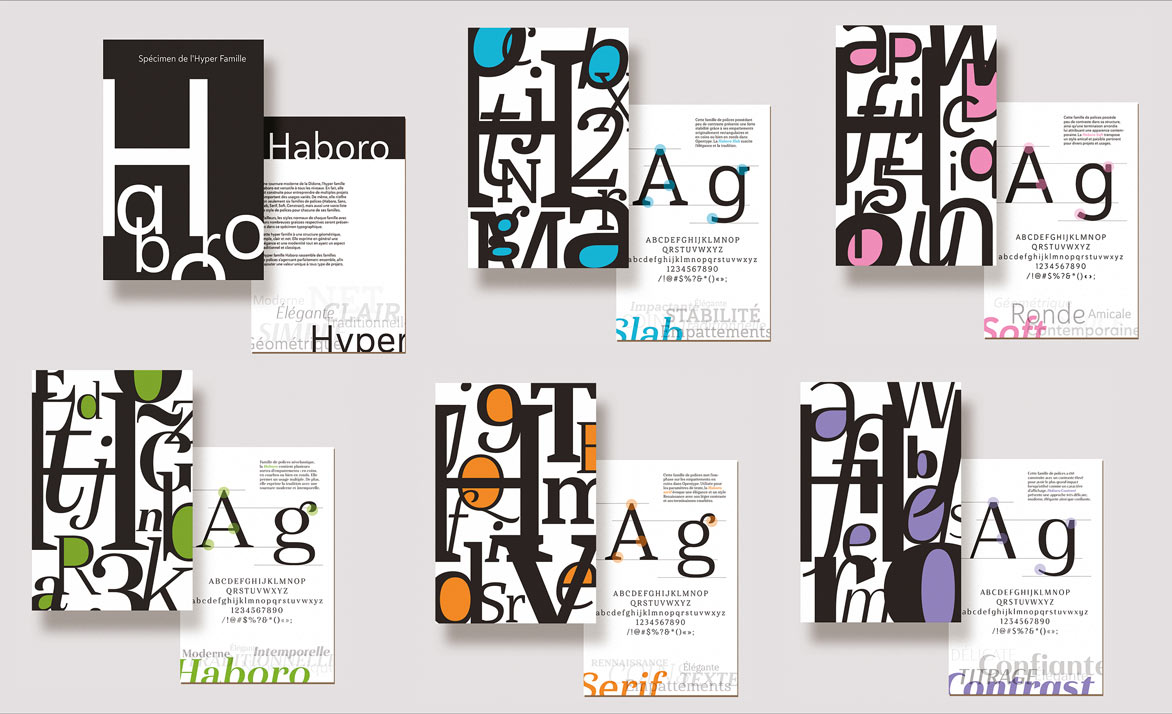 J’ai conçu un spécimen typographique illustrant les caractéristiques de l’hyperfamille Haboro, soit son élégance, sa modernité et sa forte structure géométrique. Le tout est présenté par une série d’affichettes correspondant à une grille constante et ordonnée.