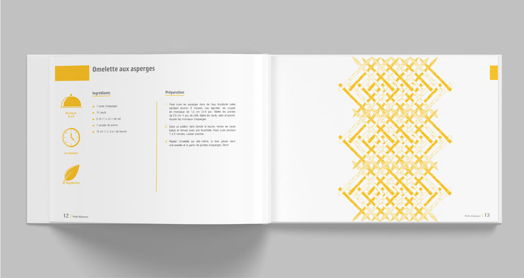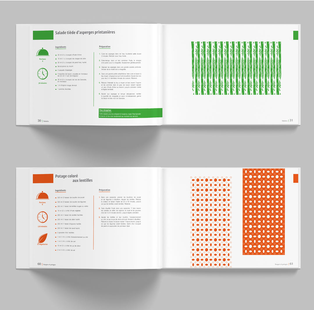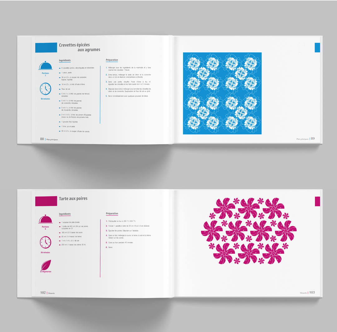 J’ai conçu et réalisé la mise en page d’un livre de recettes à partir d’un texte déjà fourni en classe. Nous devions concevoir nos propres illustrations. L’utilisation de motifs et de couleurs vibrantes pour représenter les aliments dynamise la publication et offre une expérience de lecture agréable et amusante.