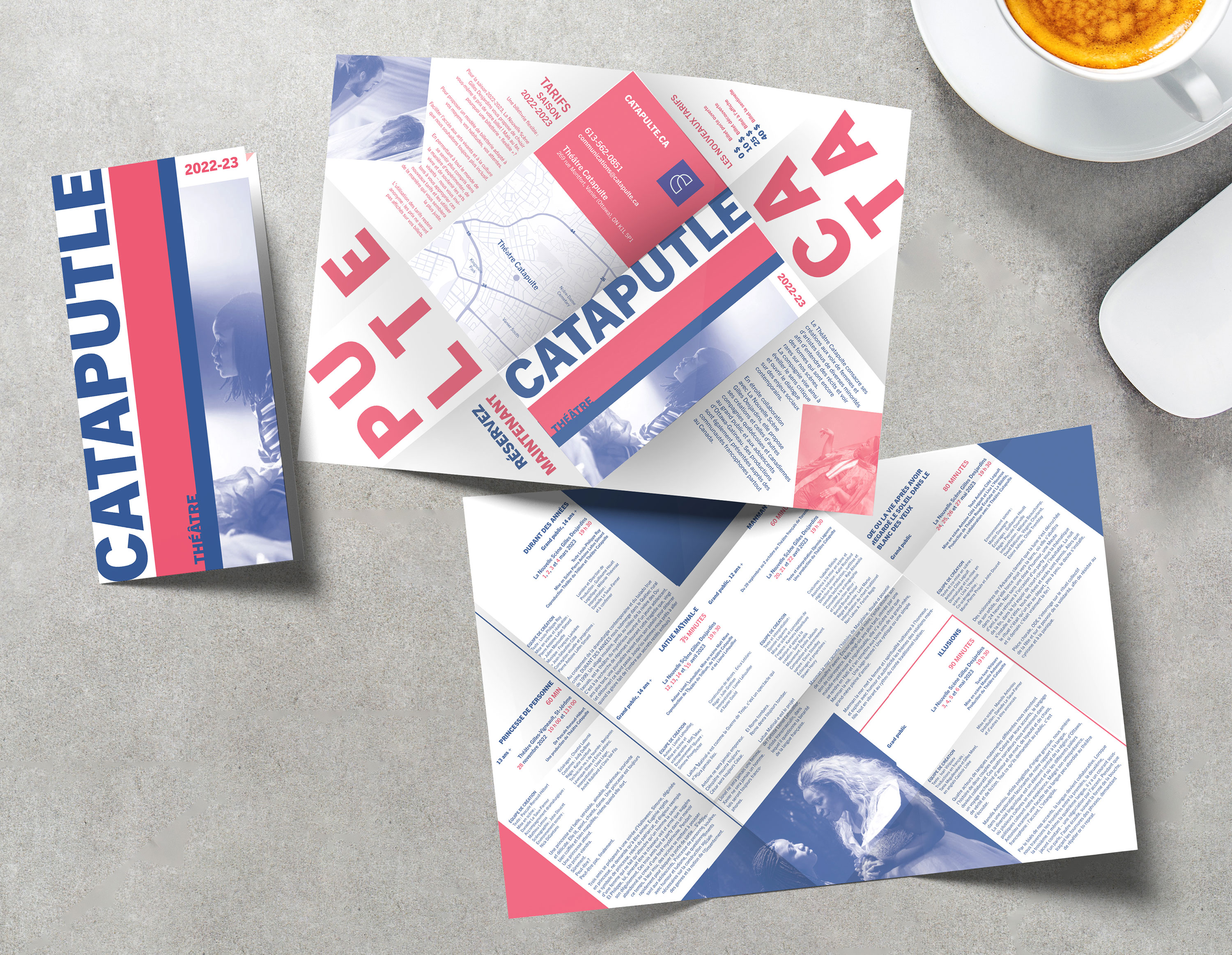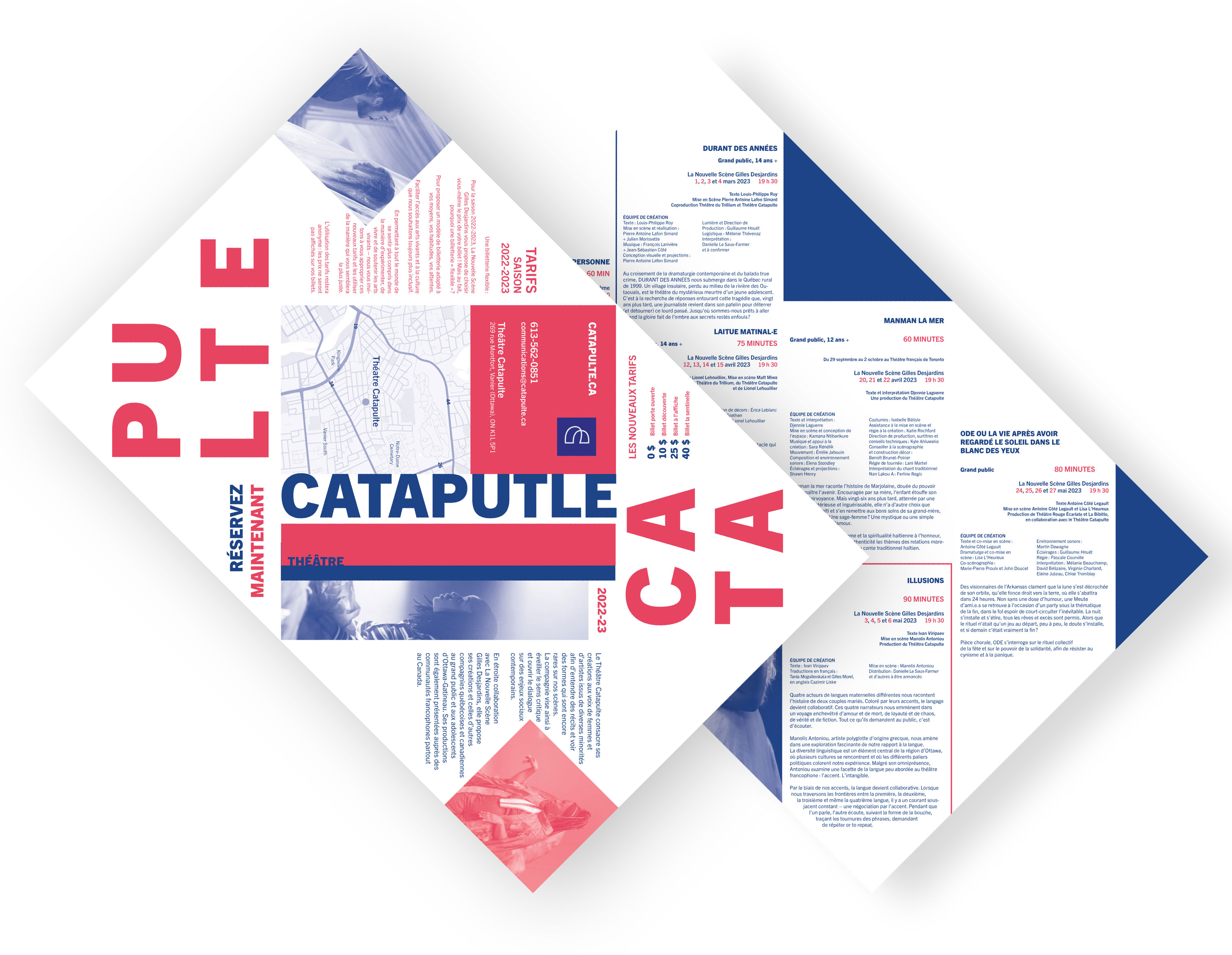 Ce dépliant unique a été produit pour la programmation du Théâtre Catapulte. Grâce à une technique de pliage complexe, le design permet d’intégrer l’ensemble du texte sur une seule feuille. Ce pliage n’est pas seulement fonctionnel, mais crée une expérience utilisateur dynamique : au fur et à mesure qu’on le déplie, différents éléments de la programmation sont révélés, guidant le lecteur à travers une piste narrative captivante. Cette approche innovante transforme l’information en une découverte, engageant le public dans un voyage parmi les événements à venir du théâtre.