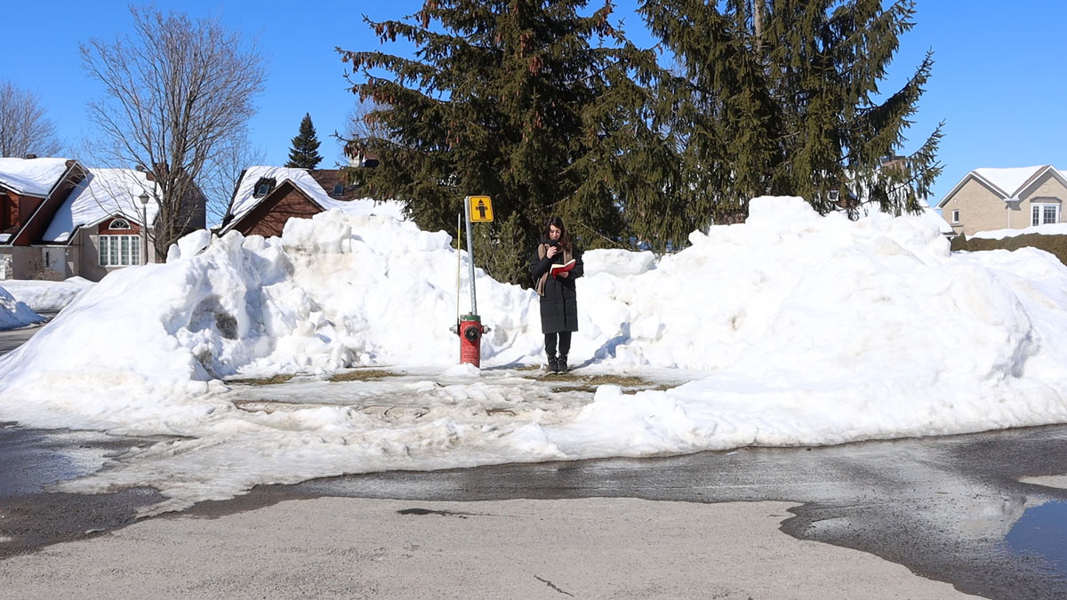 Faire la lecture à la raquetteuse, au papa dans sa dodge grand caravan rouge, à la petite fille en vélo, à ma voisine madame dion, aux éboueurs, aux corneilles, à l’avion, 2021, vidéo-performance, 45°29'2.101"N 75°43'40.39"W