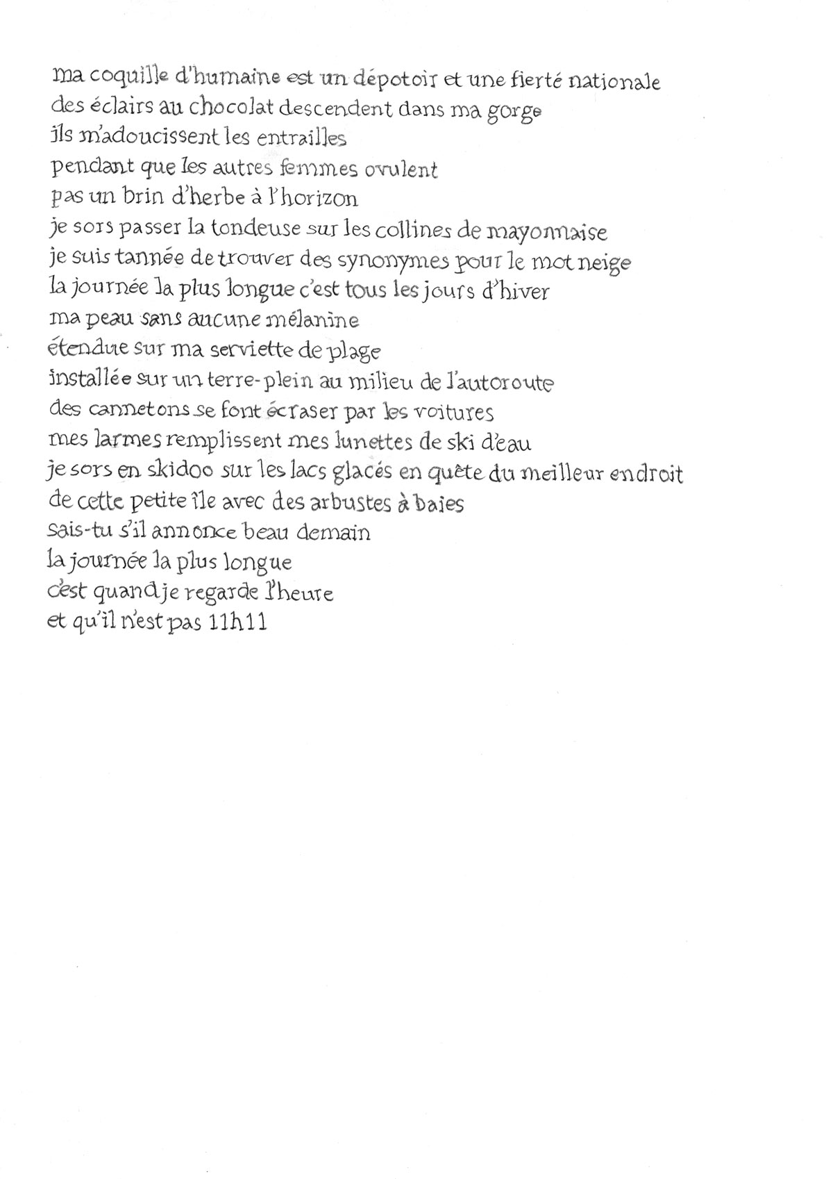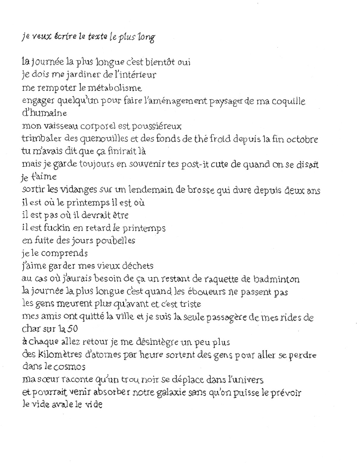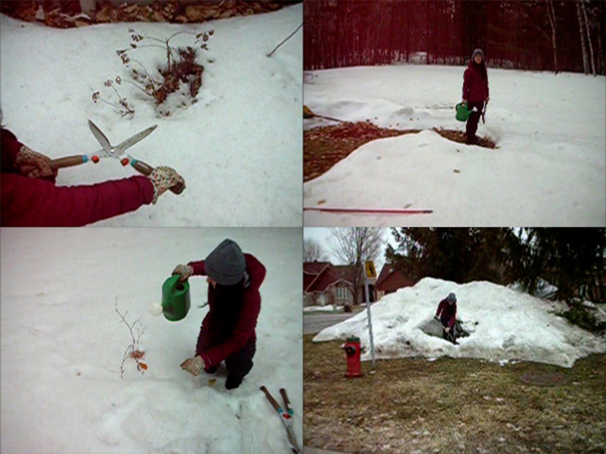 Série de tentatives rapides de modification de mon environnement : racler des feuilles mortes; arroser des branches détachées; couper ce qui est mort; balayer les rues; pelleter les restants de bancs de neige. Ces actions qui révèlent le poétique dans le banal représentent une envie de renouveau et un doux écœurement de l’hiver.