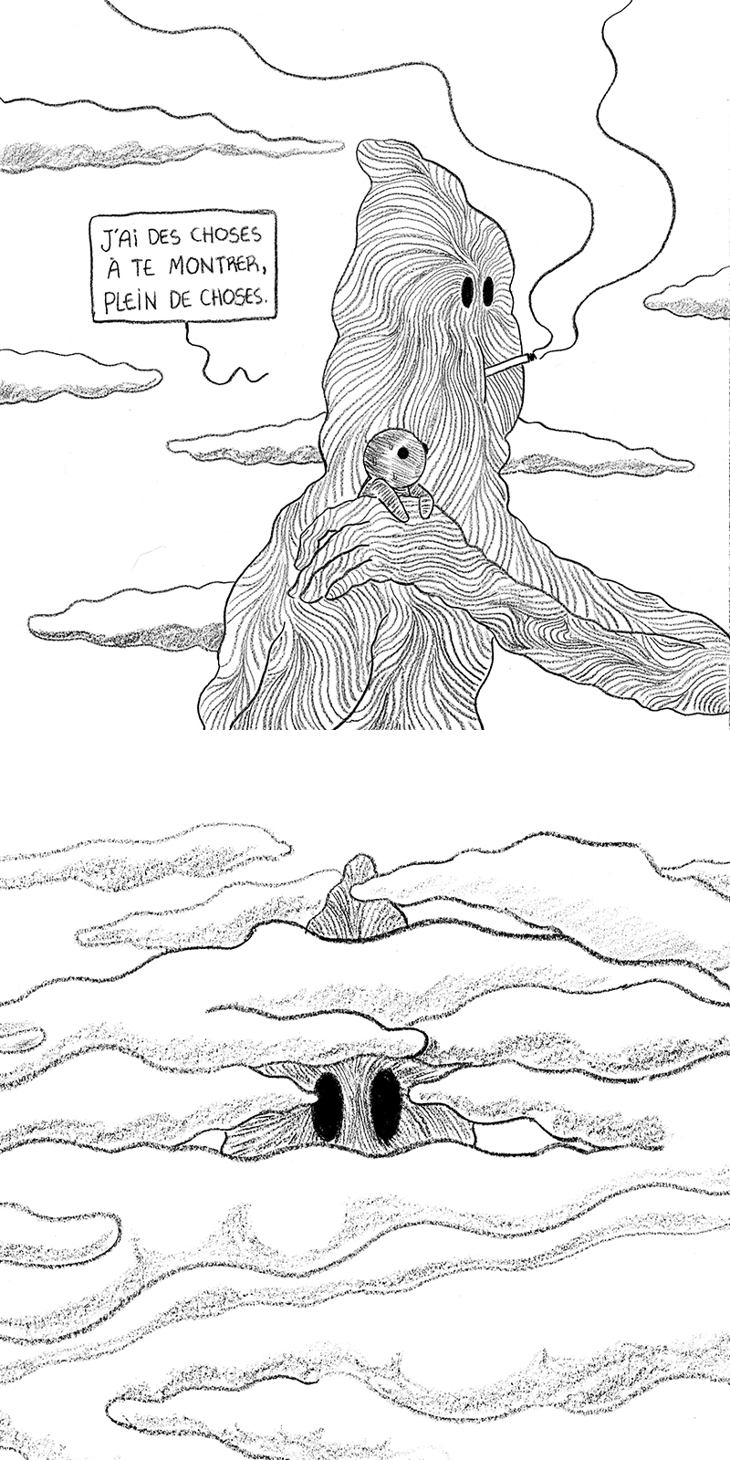 Lorsque je ne sais pas quoi faire, je fouille dans le bac de recyclage à la recherche de feuilles de papier plus ou moins propres. Ensuite, je griffonne dessus à l’aide de restants de crayons à mine HB que j’ai trouvé dans un vieux porte-crayon datant du primaire et je broche le tout. Bref, je fais de la bande-dessinée.