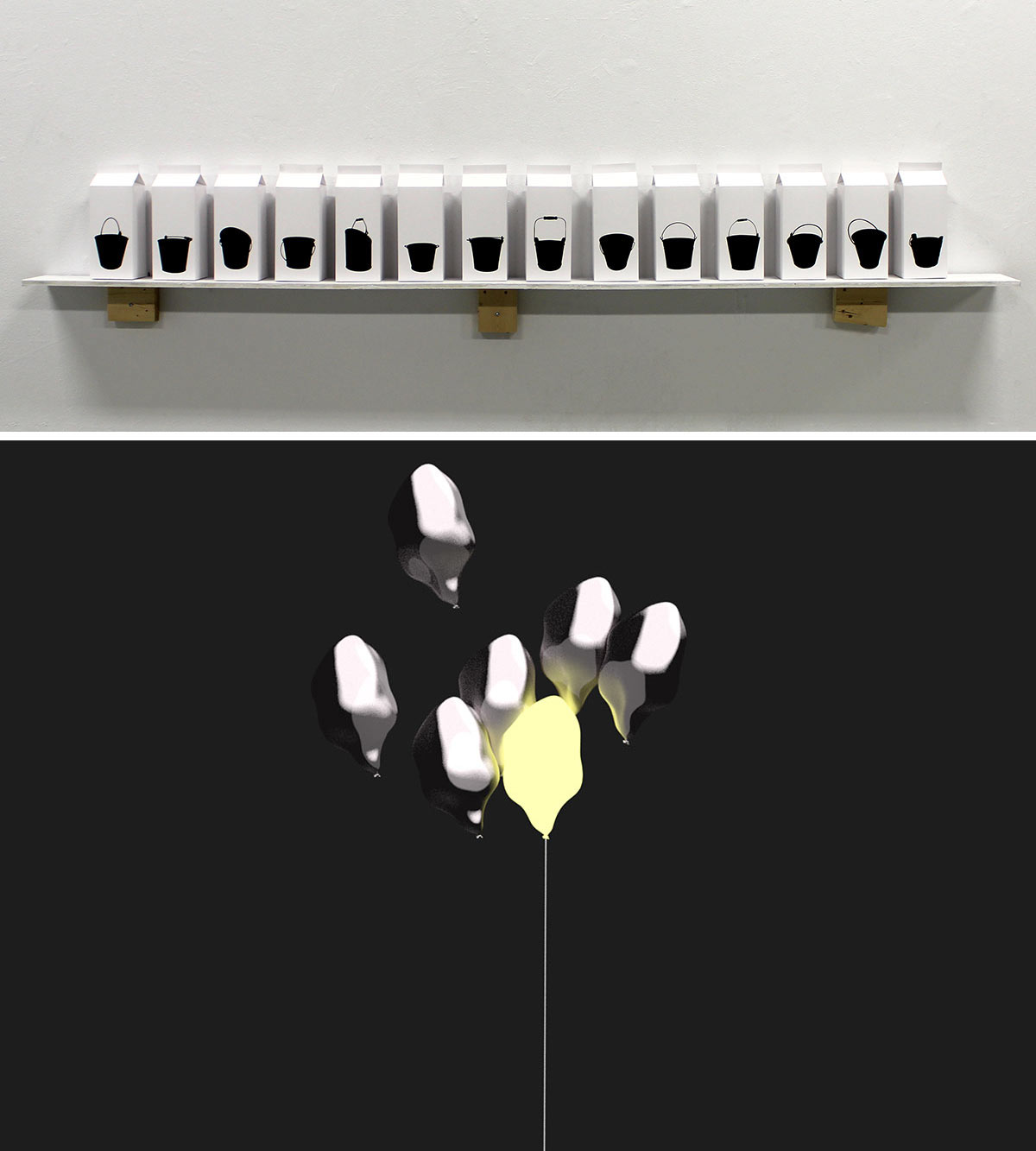 Sans titre, sérigraphie sur carton lustré, approximativement 215 × 36 × 19 cm, 2017. Sans titre (détail d’un projet en cours), image de synthèse (dimensions variables), 2018.