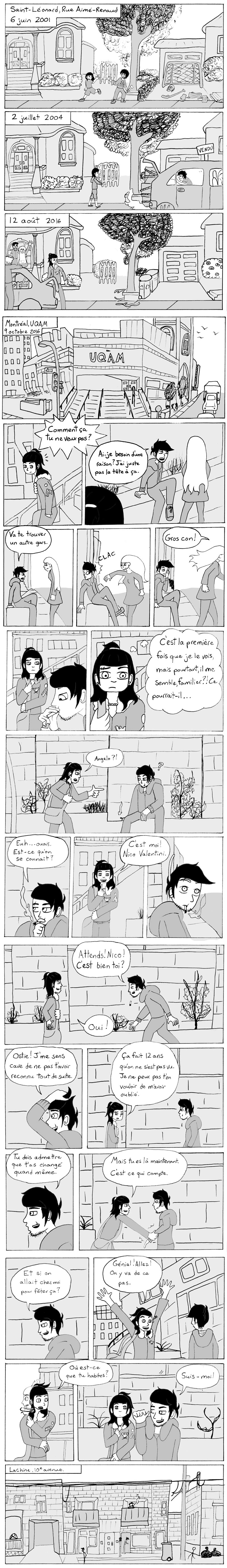 Quand je crée mes bandes dessinées, j’utilise la technique dite « old school ». C’est-à-dire : je crayonne et j’encre moi-même, parce que ça me tient à cœur de créer de mes propres mains. Cependant, pour les trames, celles-ci sont appliquées via Photoshop. J’utilise des cases rhétoriques, car il n’est pas nécessaire de mettre en scène des effets impressionnants dans mes récits. Concernant mon dessin, il se situe entre les styles manga et cartoon. J’adore la catégorie « tranche de vie ». J’aime écouter et lire le vécu des autres. Et c’est en faisant cela que je réussis à créer des personnages. Il m’arrive souvent de prendre la personnalité et les histoires des autres pour les transposer dans mes personnages.
